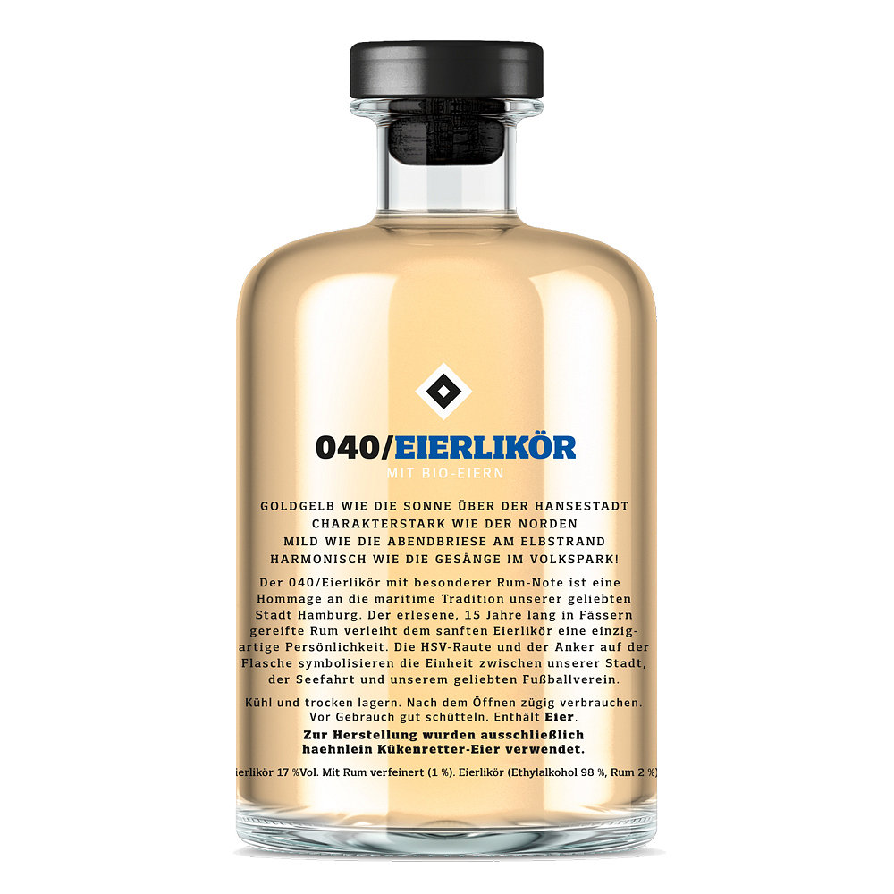 Der 040-Eierlikör mit besonderer Rum-Note ist eine Hommage an die maritime Tradition unserer geliebten Stadt Hamburg. Der 15 Jahre lang in Fässern gereifte Rum verleiht dem sanften Eierlikör eine einzigartige Persönlichkeit. Dank des schönen Designs mit der HSV-Raute macht sich die Flasche gut in jeder HSV-Bar.