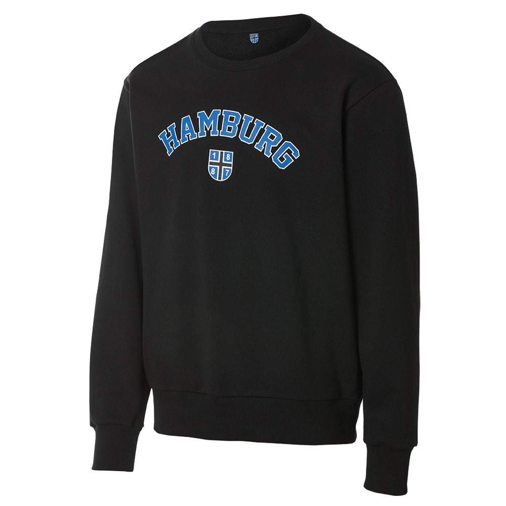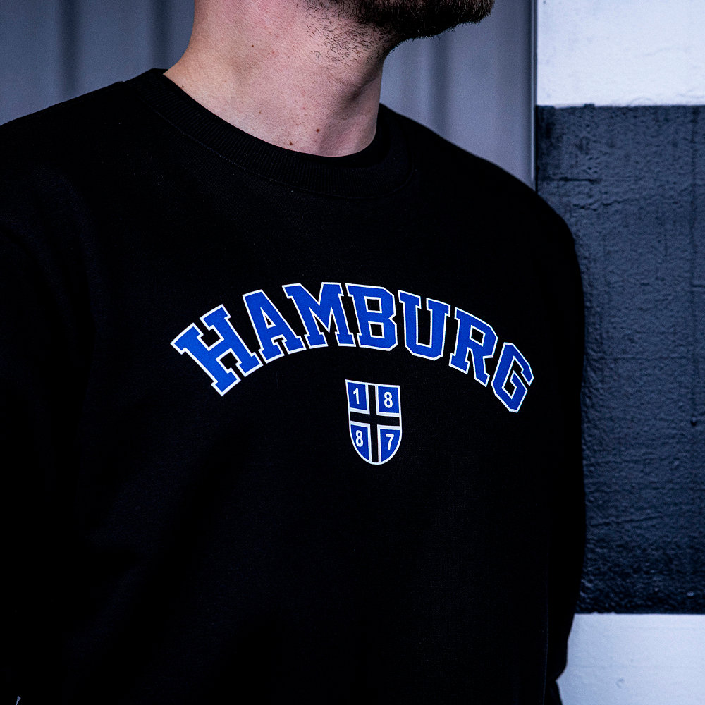 Das schwarze 1887 Sweatshirt „Hamburg“ mit dem großen "Hamburg"- Schriftzug im klassischen College-Style und dem 1887-Logo mittig auf der Brust besticht durch sein schlichtes Design.