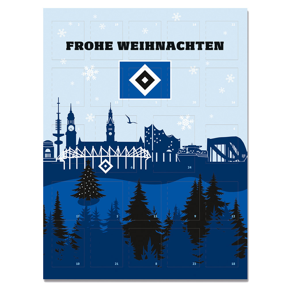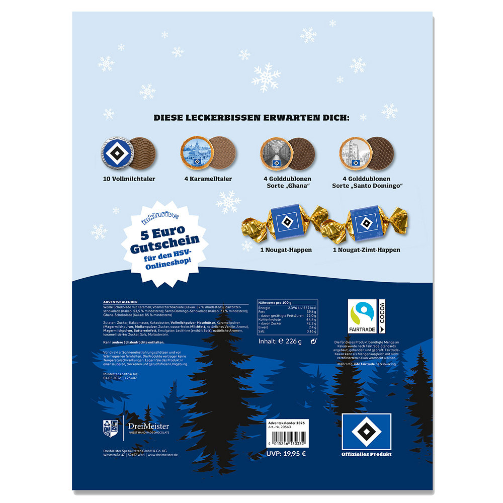 Mit dem HSV-Adventskalender steigt die Vorfreude auf ein blau-weiß-schwarzes Weihnachtsfest von Tag zu Tag! Neben vielen Schoko-Naschereien ist in dem Adventskalender außerdem ein 5,- Euro Gutschein* im Kalenderrücken für den HSV-Onlineshop versteckt.