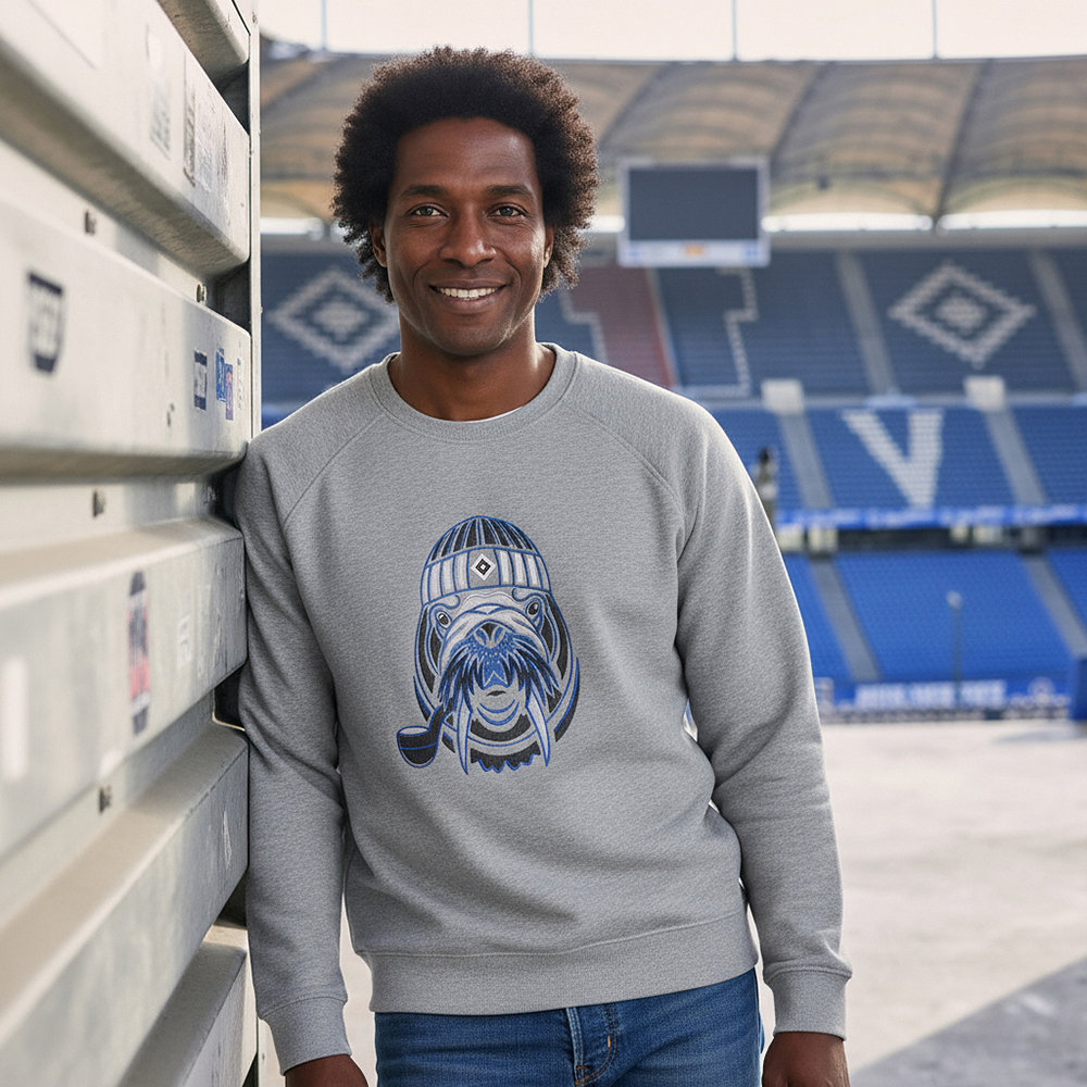Das graue derbe Sweatshirt „Walross“ mit Walross-Stick mit HSV-Raute wird durch einen „derbe x HSV“-Schriftzug im Nacken abgerundet. Der Pullover macht auf einem Blick deutlich, für welchen Verein dein Herz schlägt.