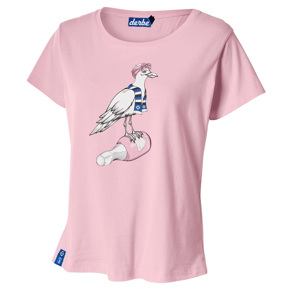Das rosa derbe Damen T-Shirt „Sturmmöwin“ mit großem Möwen-Print vorne ist perfekt für warme Sommertage. Das Shirt wird abgerundet durch ein Derbe-Logo-Patch am unteren Saum.