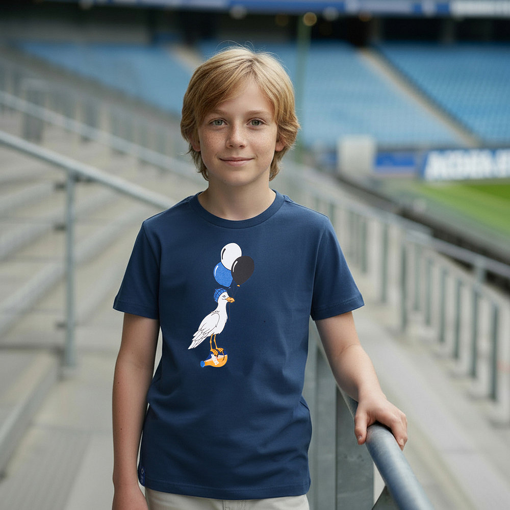 Das dunkelblaue T-Shirt Kids „Ballonmöwe“ vom HSV mit großem Möwe-Print mit blau-weiß-schwarzen Luftballons auf der Vorderseite macht sofort jedem klar, für welchen Verein dein Herz schlägt. Egal ob im Stadion, auf dem Spielplatz oder zu Hause - dieses Kinder T-Shirt vom HSV ist der perfekte Begleiter für junge Fans, die ihre Verbundenheit zu ihrem Team zeigen möchten.