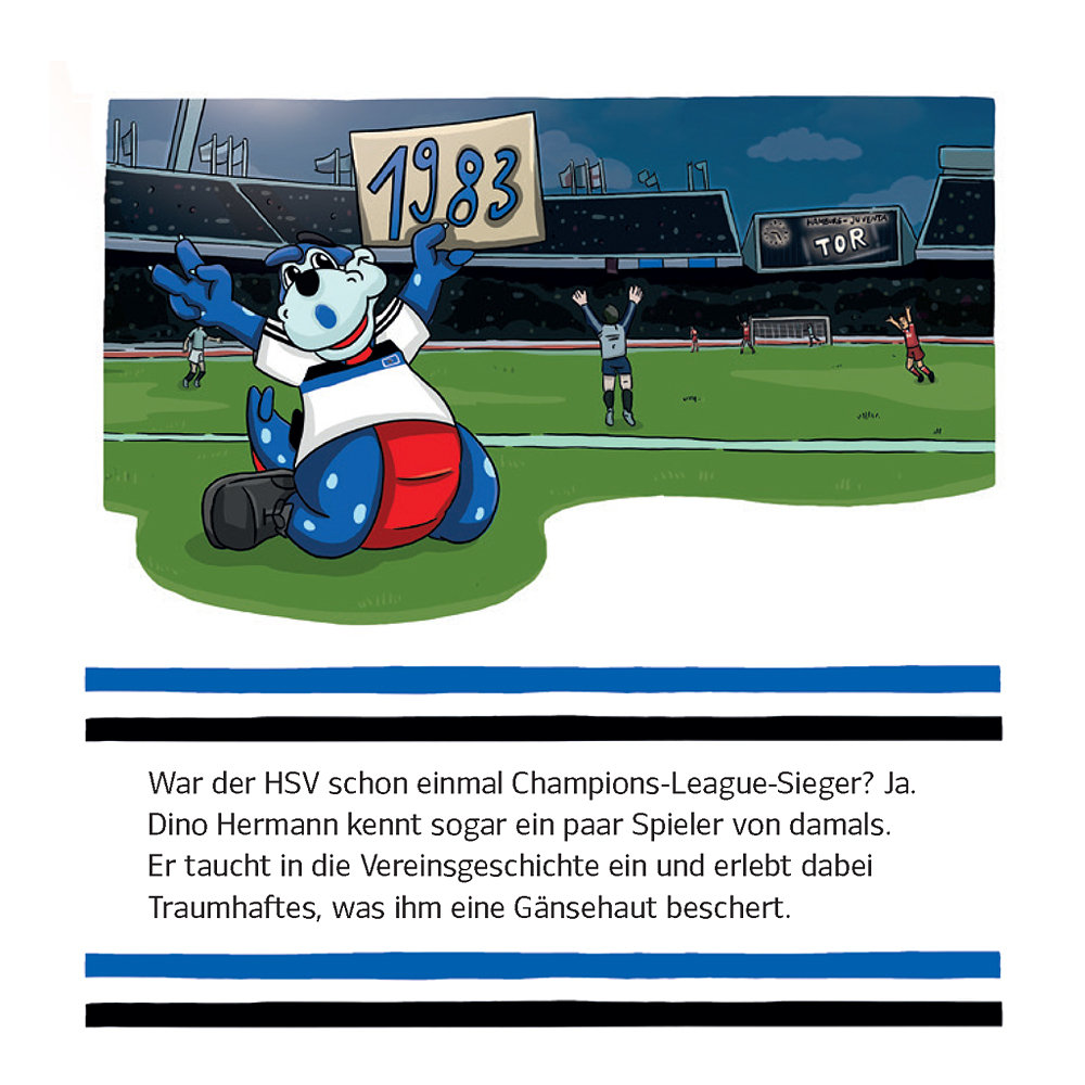In „Dino Hermann und der Europapokal“ schaut das Maskottchen im HSV-Museum rein und trifft die 83er-Mannschaft vom HSV.