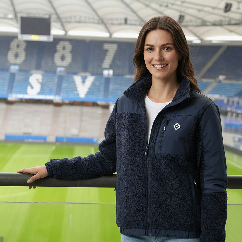 Im Kampf gegen stürmisches Wetter bist du mit der Damen Fleecejacke „Gonda“ dank des hochschließenden Kragens bestens ausgestattet. Die dunkelblaue Damenjacke mit dem kuscheligen Außenmaterial, zwei Reißverschlusstaschen an der Seite und einer Reißverschlusstasche auf der Brust wird abgerundet durch die HSV-Raute auf der linken Brustseite. So wird jedem klar, für welchen Verein aus Hamburg dein Fanherz schlägt.