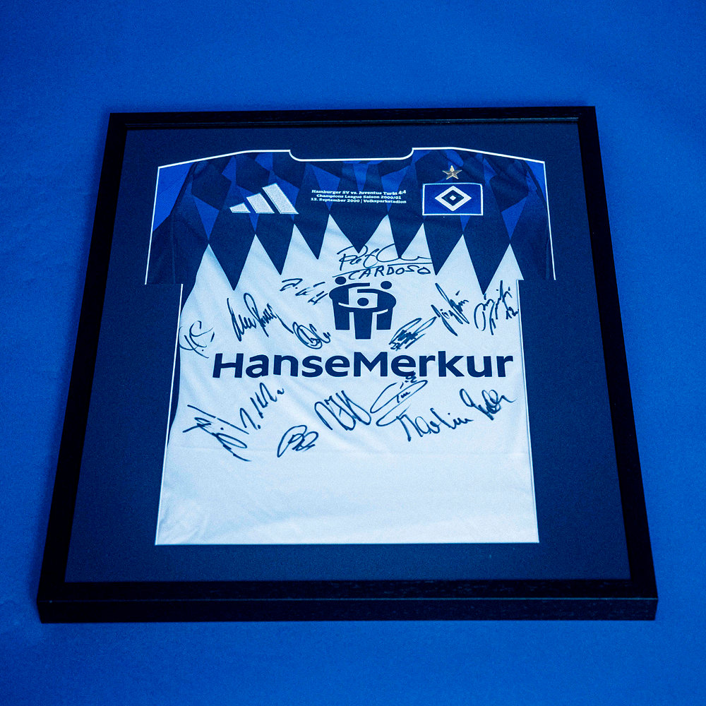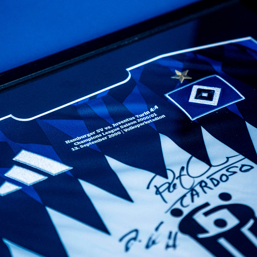 Zum 25. Jubiläum des legendären 4:4 gegen Juventus Turin am 13. September 2000 wurde dieses Heimtrikot der Saison 2025/26 von den Helden von damals persönlich signiert. Unter den Unterschriften finden sich zahlreiche Spieler, die an jenem unvergesslichen Champions-League-Abend im Volksparkstadion beteiligt waren.