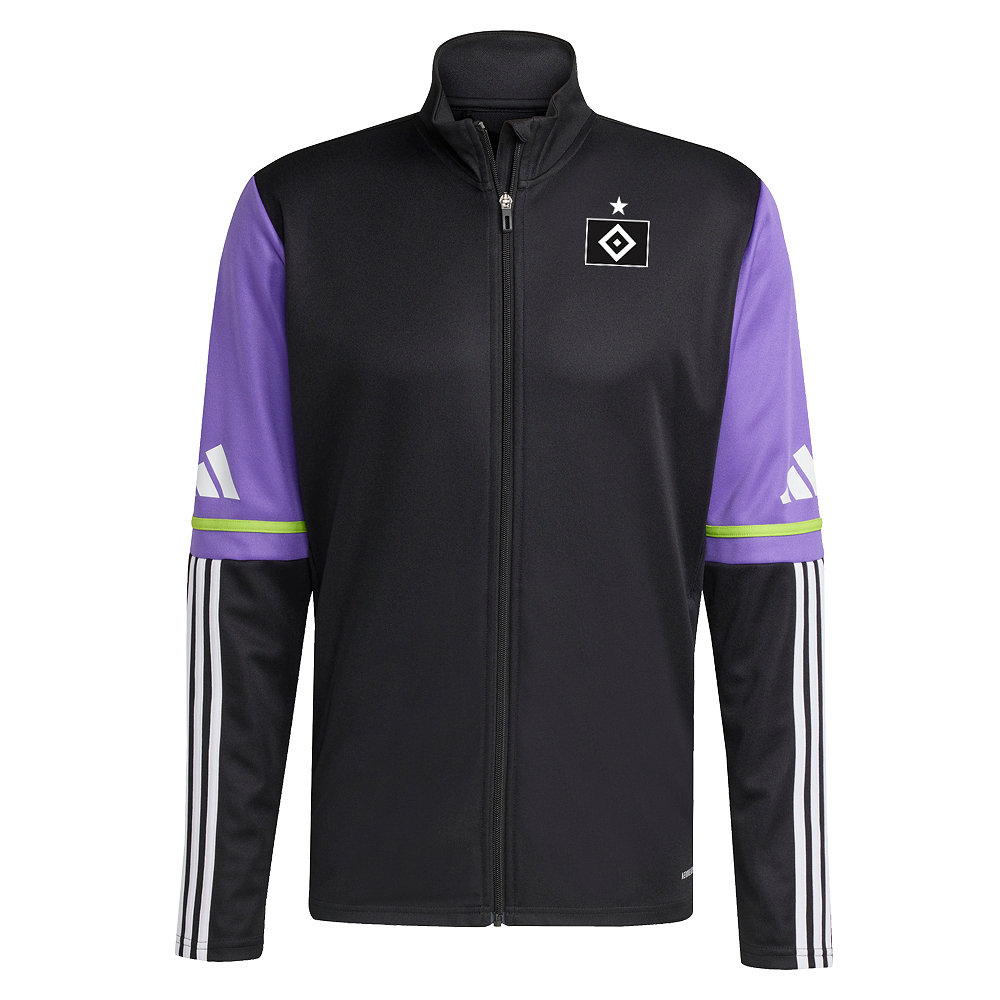 Die schwarze adidas Trainingsjacke vom HSV mit HSV-Raute auf der linken Brust und adidas-Logo auf den Ärmeln wird durch die drei weißen Streifen an den Ärmelenden abgerundet. Die feuchtigkeitsabsorbierende AEROREADY Technologie sorgt für ein angenehm trockenes Tragegefühl.