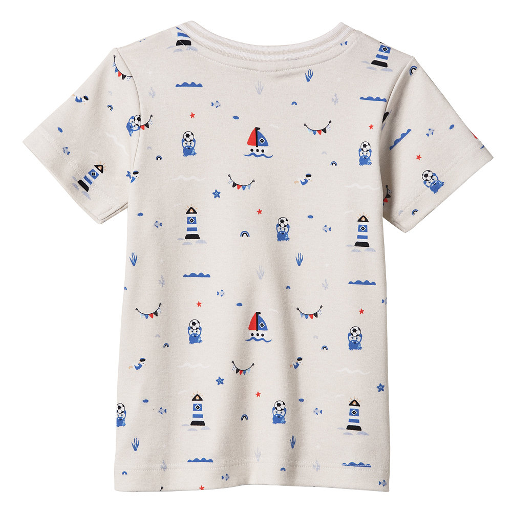 In diesem maritimen Hansekind Babyshirt „Meer“ fühlt sich jedes Baby sofort wohl! Das beigefarbene T-Shirt mit farbenfrohem Allover-Print mit Segelboot, Krebs und HSV-Leuchtturm vorne und hinten lässt sich dank der praktischen Druckknöpfe leicht An- und Ausziehen.