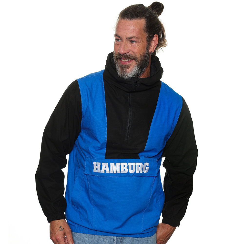 Ob beim Stadionbesuch, beim Spaziergang oder beim Stadtbummel: Die blau-schwarze Jacke „Jorin“ ist der ideale Begleiter für jeden Tag. Mit der Schlupfjacke mit HAMBURG-Stick vorne auf Bauchhöhe und gesticktem HSV-Schriftzug sowie HSV-Raute auf dem linken Arm zeigst du deine Unterstützung zu deinem Hamburger Sport-Verein. Dank der großen Brusttasche hast du viel Platz für nützliche Kleinigkeiten.