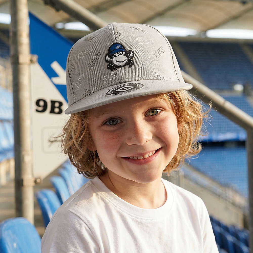 Die graue Kinder Kappe „Kristian“ ist der ideale Begleiter für Schule und Stadion. Der gerade Schirm der Cap schützt vor Sonne, damit unsere Nachwuchs-Fans immer den Durchblick behalten. Ein besonderes Detail ist das Silikonelement auf der Front, das einen Krebs mit HSV-Mütze zeigt. Ergänzt wird das Design durch einen Allover-HSV-Schriftzug. Dank der Größenverstellung sitzt die Kinder Cap bequem und sicher.