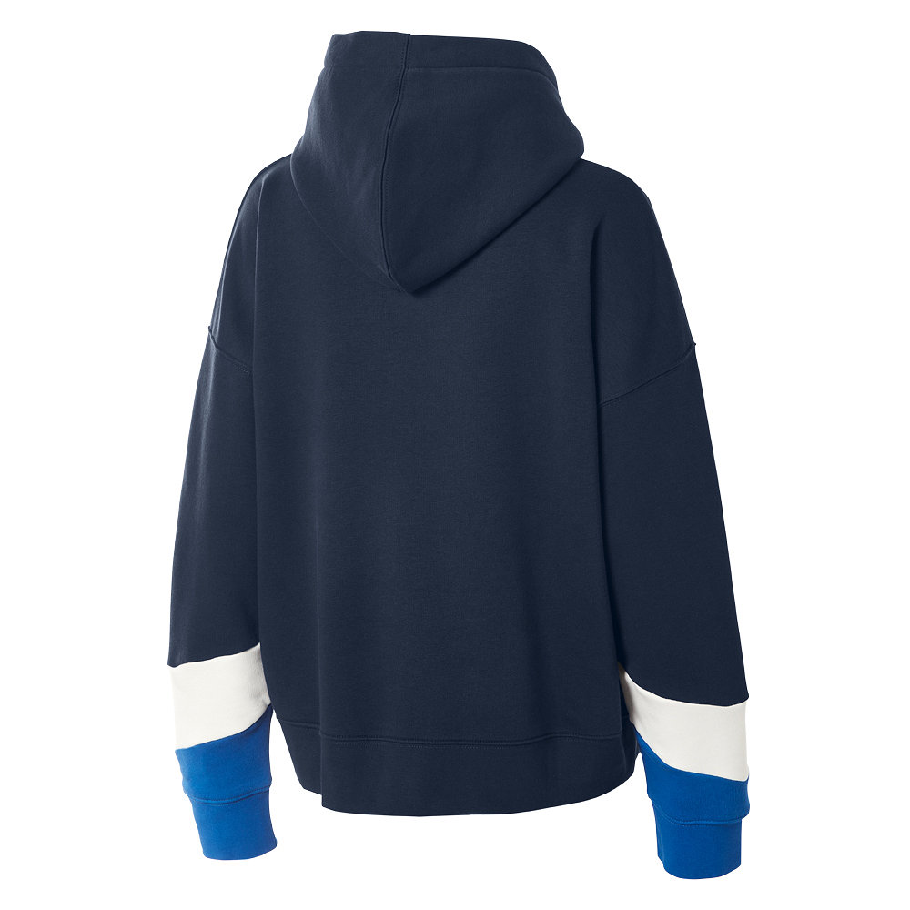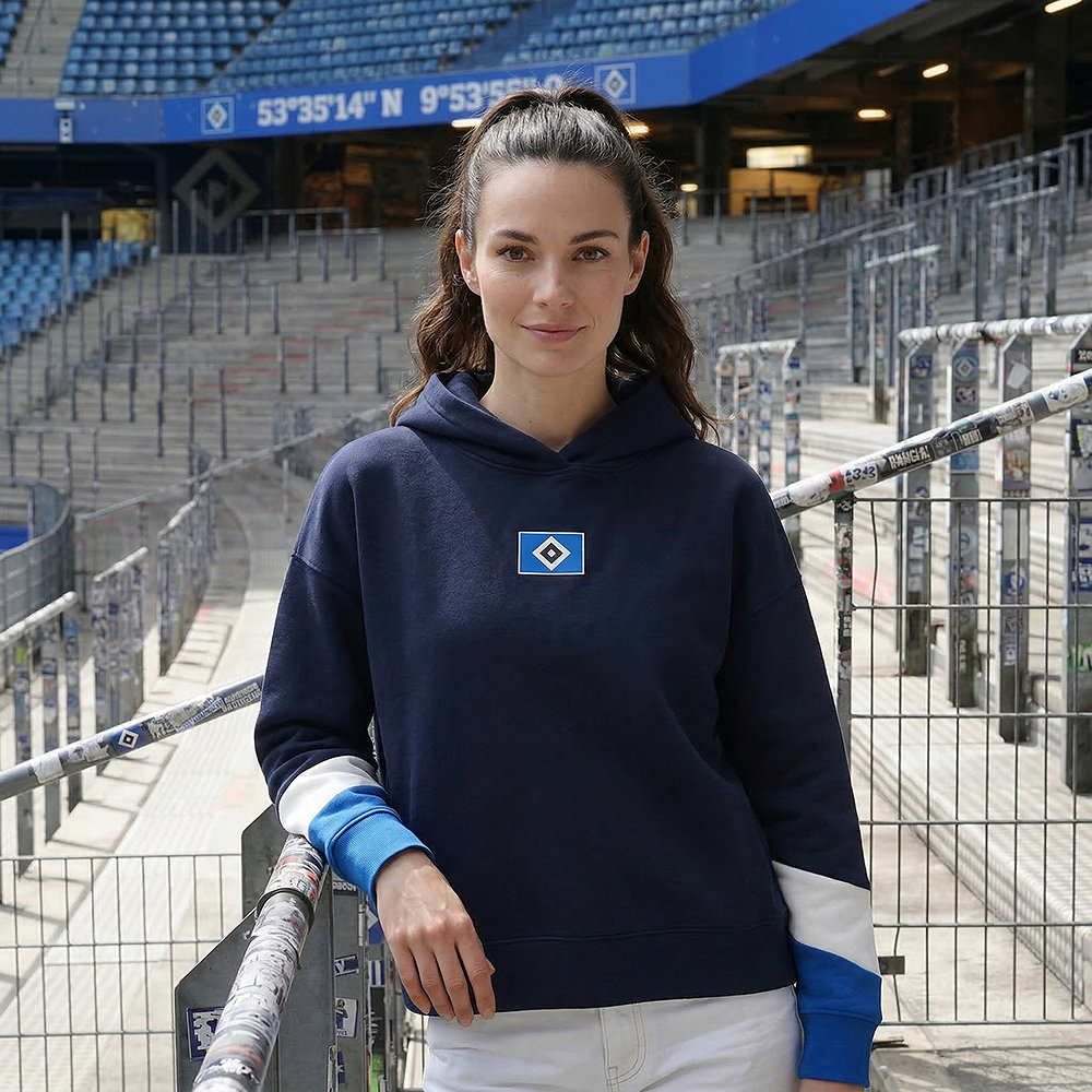 Der dunkelblaue Damen Kapuzenpullover „Marthe“ vom HSV ist ein bequemer Alltagsbegleiter und zeigt durch die HSV-Raute mittig auf der Brust gleichzeitig deutlich, für welchen Verein dein Herz schlägt. Der Hoodie mit Kapuze wird durch den blauen und weißen Balken an den Ärmelenden abgerundet.
