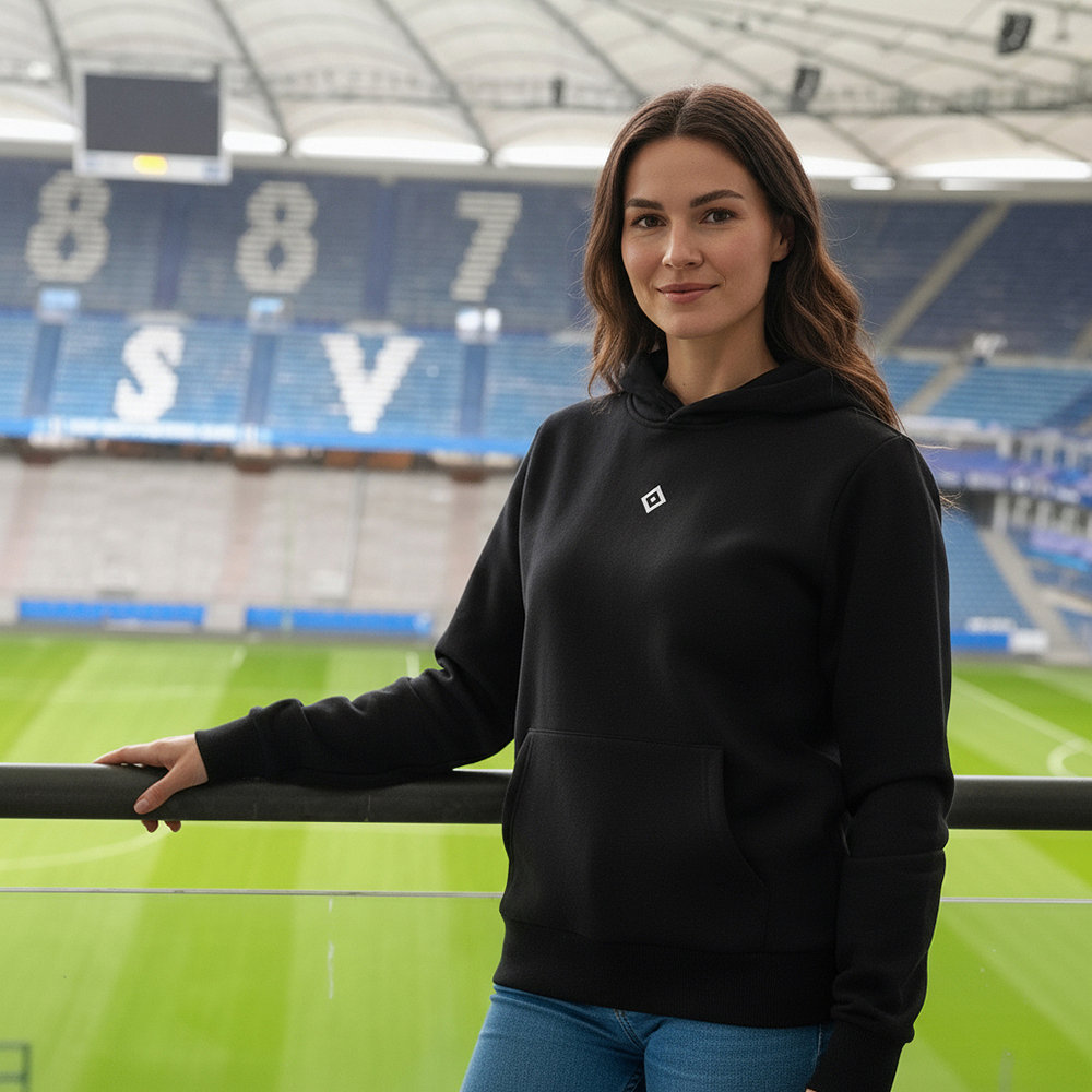 Der schwarze Damen Kapuzenpullover „Nini“ vom HSV ist ein bequemer Alltagsbegleiter und zeigt gleichzeitig deutlich, für welchen Verein dein Herz schlägt. Der Hoodie mit Kängurutasche und Kapuze wird durch die HSV-Raute mittig auf der Brust abgerundet.