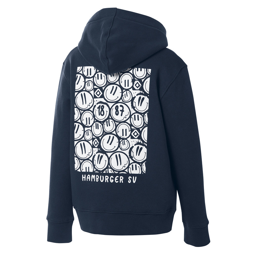 Der blaue Kinder-Kapuzenpullover „Joke“ vom HSV kombiniert gute Laune mit echter Fanliebe. Das großflächige Rückendesign mit Smileys, HSV-Raute und „1887“-Schriftzug macht den Hoodie zu einem echten Hingucker auf dem Schulhof und in der Freizeit. Vorne ist ein Ausschnitt des Rückenmotivs dezent auf der linken Brust platziert und greift das Design stilvoll auf.