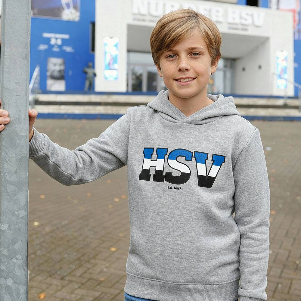 Der graue Kinder Kapuzenpullover „Nias“ mit großem blau-weiß-schwarzen HSV-Schriftzug und „est. 1887“-Schriftzug wird durch eine HSV-Raute auf der Kapuze abgerundet. Die elastischen Rippbündchen und die Kapuze tragen zu einem gemütlichen HSV-Style bei.