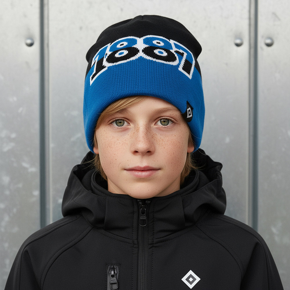 Ideal für die Schule oder für den Ausflug ins Volksparkstadion an kalten Tagen: Die blau-weiß-schwarze Kindermütze „Joan“. Die Mütze mit 1887-Schriftzug wird durch eine HSV-Raute am Mützensaum abgerundet.