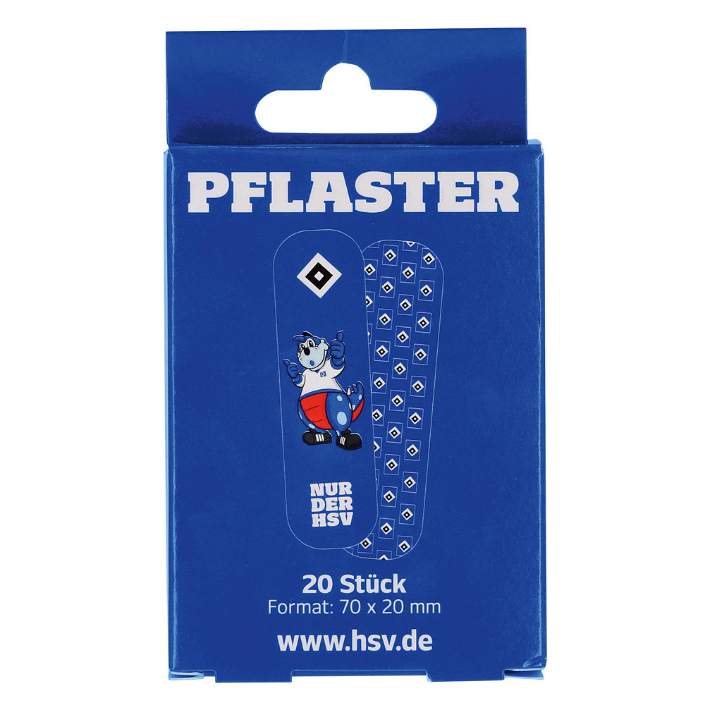 Kleine Blessuren? Kein Problem: Mit dem Pflaster-Set „Raute“ bist du bestens versorgt! Ob beim Bolzen auf dem Platz, beim Training oder im Alltag: Unsere blauen Pflaster mit „Dino Hermann“-Motiv und HSV-Raute lassen kleine Schrammen schnell vergessen. So zeigst du auch in den kleinen Momenten, für welchen Verein dein Herz schlägt.