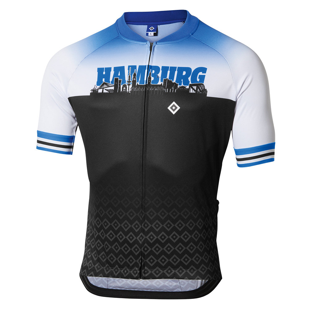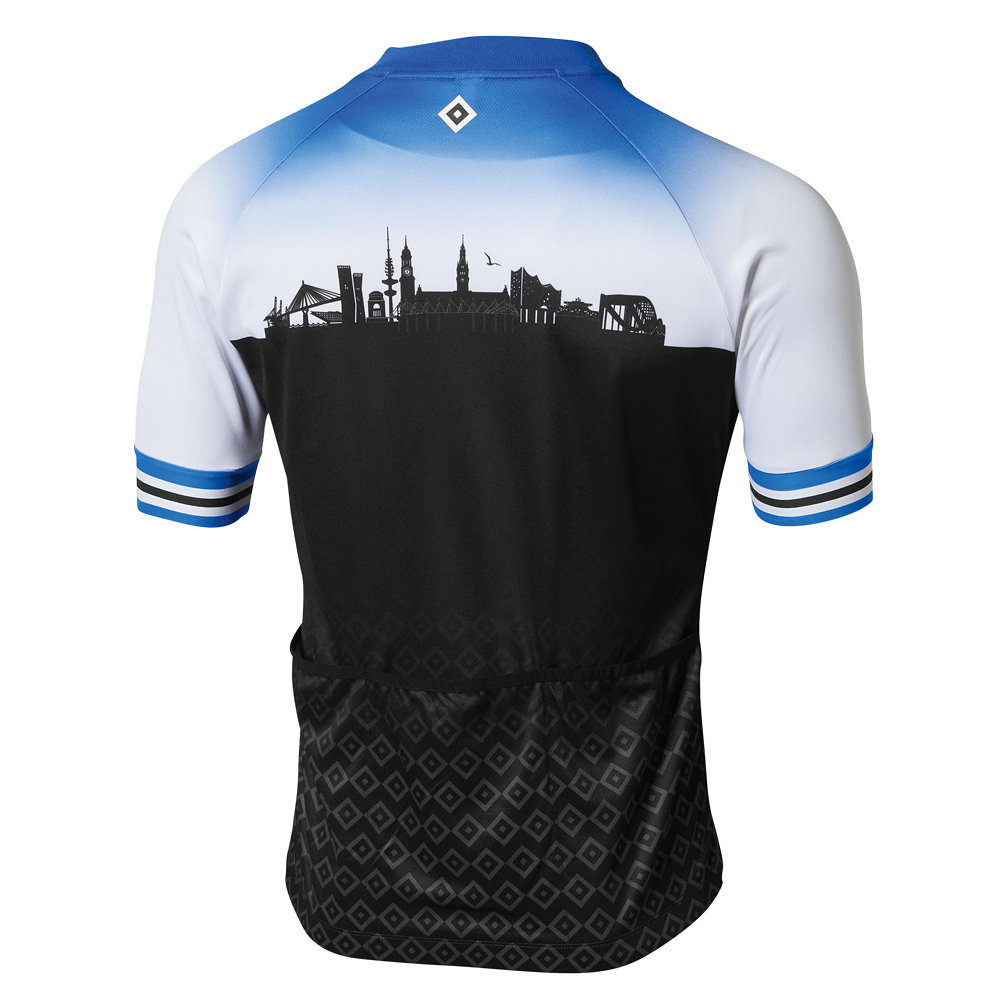 Das Radtrikot „Skyline“ ist sowohl für Profis als auch für den Freizeitradler geeignet und besitzt eine enganliegende, aber komfortable Passform. Durch einen elastischen Abschluss mit Silikon-Element am Bund und den drei Rückentaschen eignet sich das Trikot hervorragend für Ausfahrten mit dem Fahrrad. Neben der HSV-raute auf der linken Brust ist auf der Vorderseite ein Hamburg-Schriftzug und die Skyline abgebildet. Die Rückseite wird abgerundet durch die Hamburger Skyline und einer HSV-Raute im Nacken.