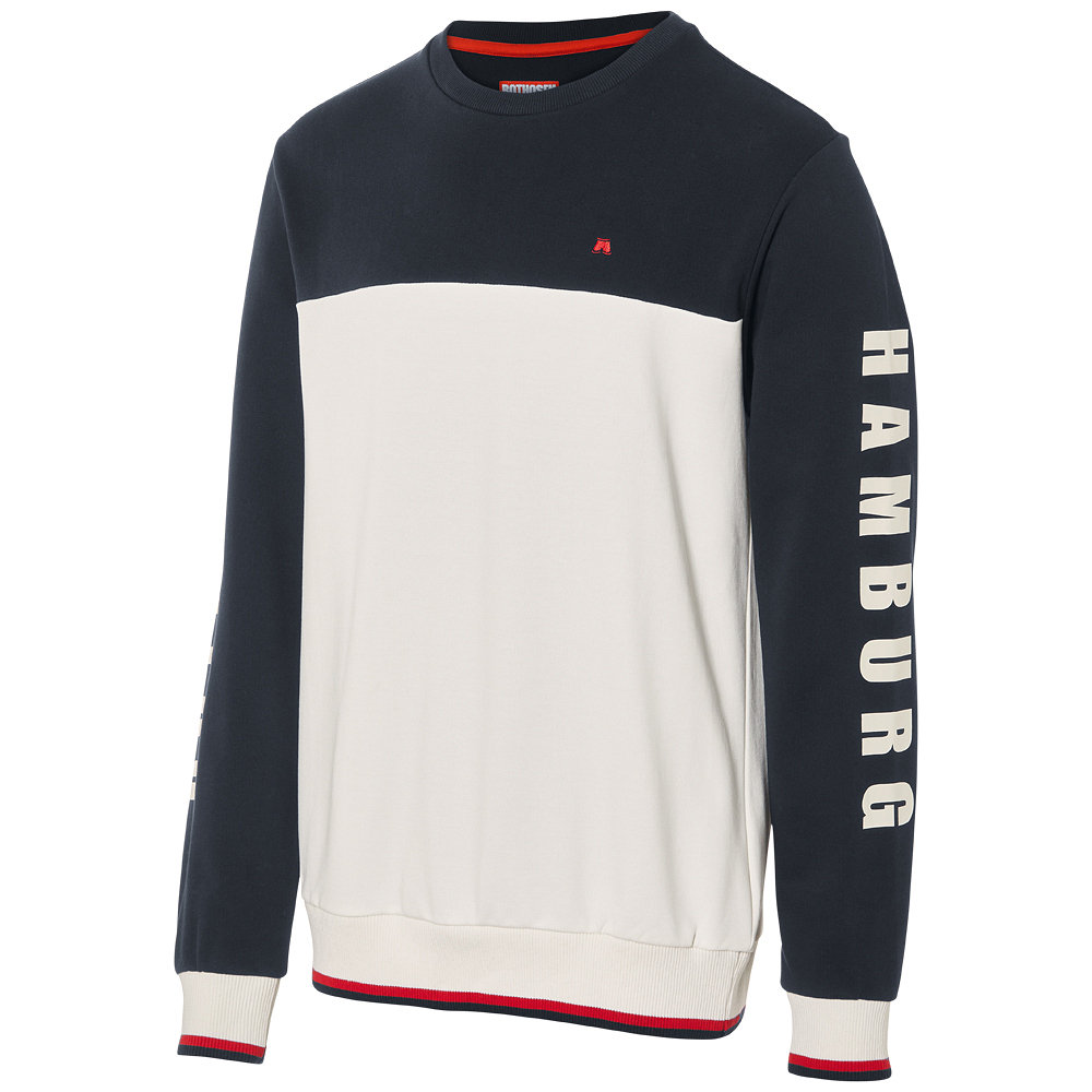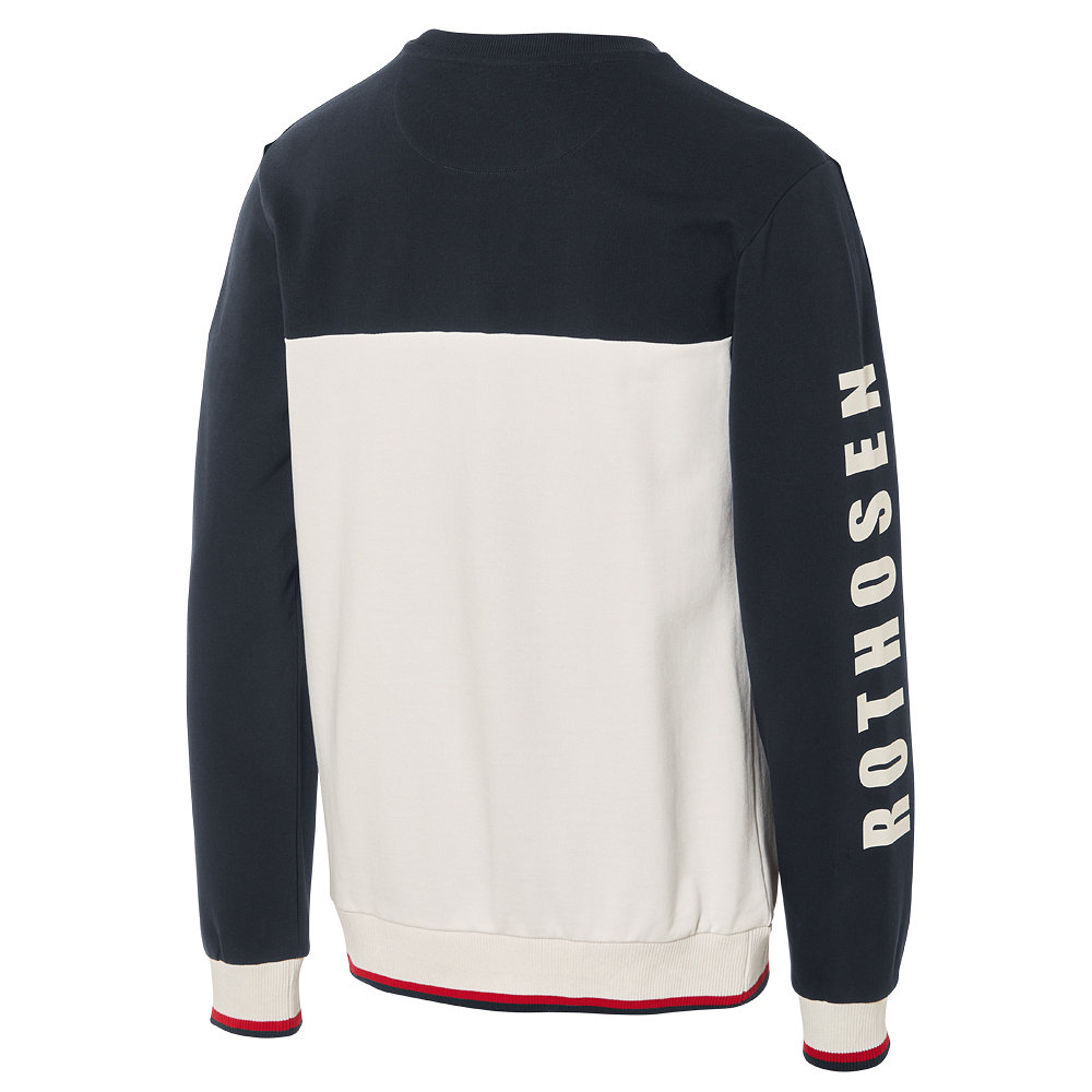 Das dunkelblau/off-White Sweatshirt „Schiffsrumpf“ aus unserer nachhaltigen Rothosen-Kollektion mit dunkelblauem Oberteil und Ärmeln mit „Rothosen“- und „Hamburg“ Schriftzug wird durch eine eingestickte rote Rothose auf der linken Brust abgerundet. Der Pullover macht dabei deutlich, für welchen Verein aus Hamburg dein Herz schlägt.