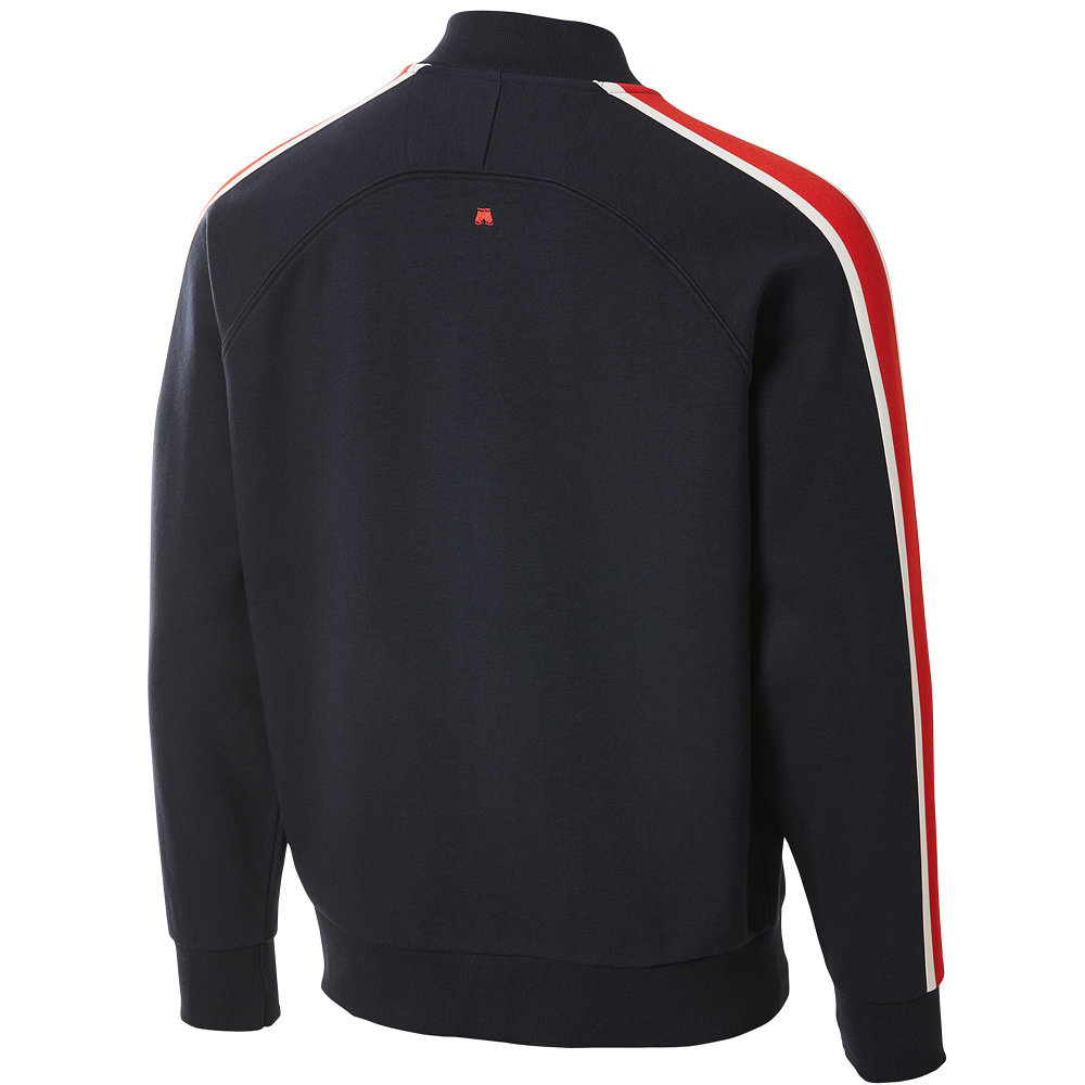 Die dunkelblaue Trainingsjacke „Boje“ aus unserer nachhaltigen Rothosen-Kollektion mit rot-weißen Streifen an Schulter und Ärmeln wird durch ein Badge auf der linken Brust abgerundet. Im Nacken hat die Jacke eine gestickte Rothose.