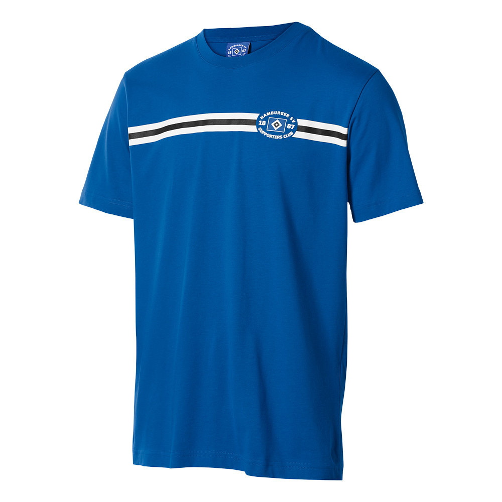 Zeig deine Verbundenheit zum HSV mit dem blauen Supporters Club T-Shirt „Balken blau“. Das Shirt mit weiß-schwarzen Streifen wird durch das SC-Logo auf der linken Brust abgerundet und macht deutlich, für welchen Verein dein Herz schlägt.