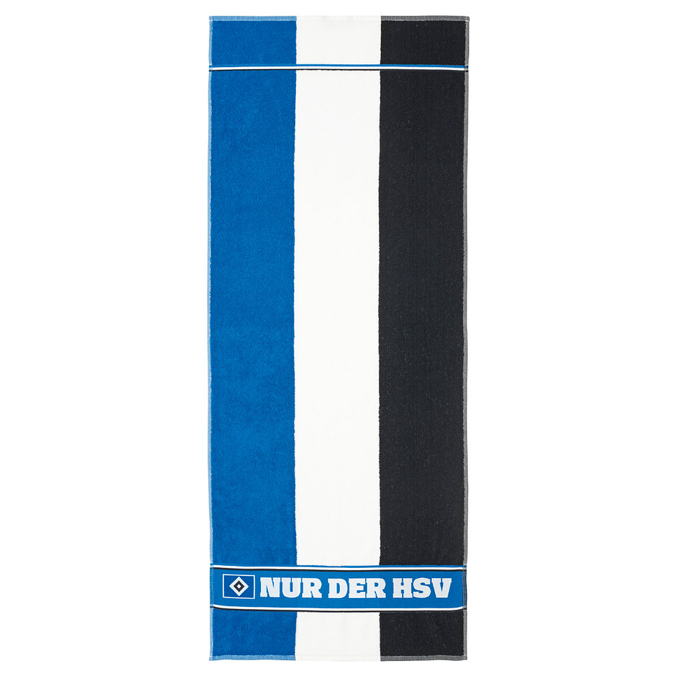 Für ein HSV-Feeling in deinem Badezimmer: Das flauschig-weiche Saunatuch im Blockstreifen-Design. Das Badetuch mit den Blockstreifen in den Vereinsfarben Blau, Weiß und Schwarz und HSV-Raute und „Nur der HSV“-Schriftzug auf der blauen Bordüre zeigt, für welchen Verein dein Herz schlägt.