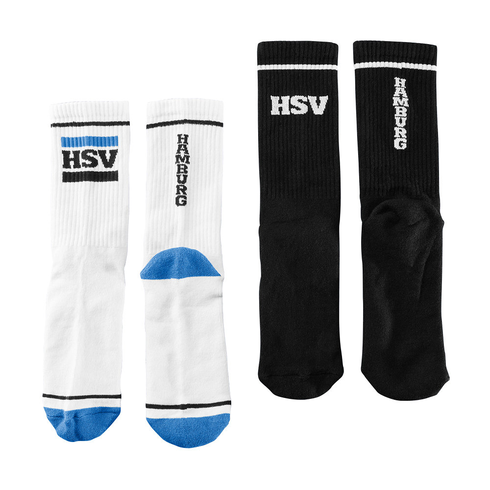 Hose hoch und HSV zeigen: Und mit dem Sportsocken 2er-Set „Block“ geht das gleich doppelt. Das Set besteht aus einem schwarzen und einem weißen Paar Tennissocken. Beide Paare haben auf der einen Socke einen „HSV“- und auf der anderen Socke einen „Hamburg“-Schriftzug über den Knöcheln und sind der perfekte Begleiter beim Sport und in der Freizeit.