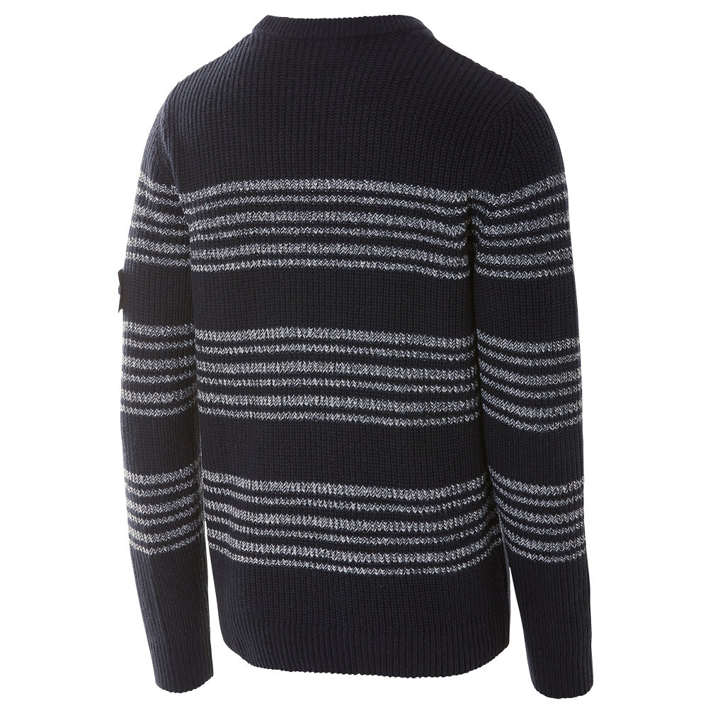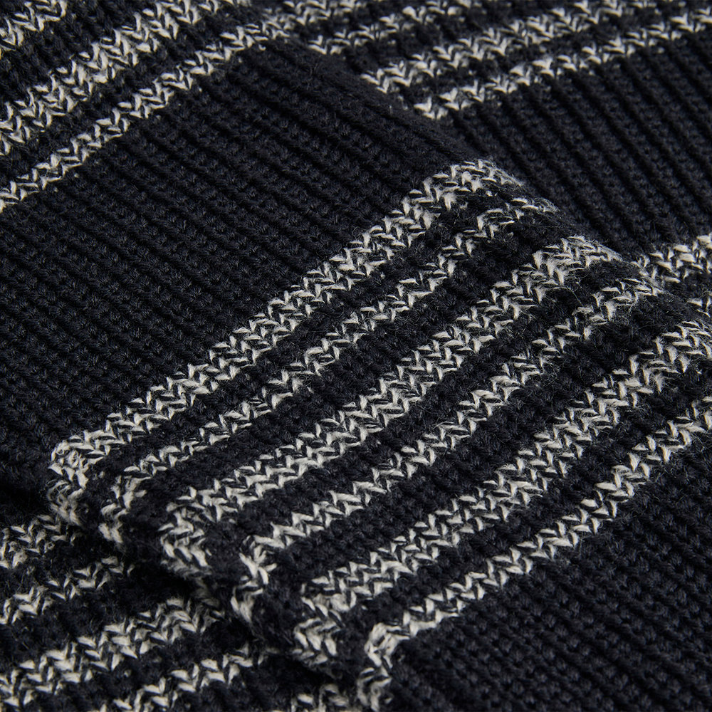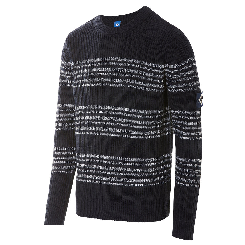 Der dunkelblaue Strickpullover „Aaron“ mit weißen Streifen ist perfekt für kühle Tage und demonstriert ein perfektes Zusammenspiel zwischen Alltagstauglichkeit und Fankleidung. Der Pullover wird durch ein Ärmelbadge mit HSV-Raute am linken Arm abgerundet.
