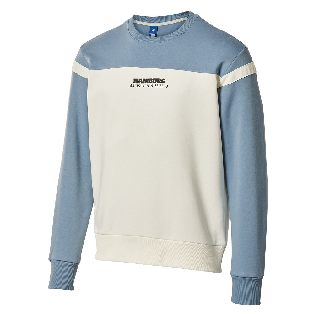 Mit dem offwhite-hellblauen Sweatshirt „Cameron“ vom HSV zeigst du ein klares Bekenntnis zu deinem HSV! Der „Hamburg“-Schriftzug sowie die Koordinaten für den Mittel- und Anstoßpunkt im Volksparkstadion auf der Brust zeigen, wo dein Herz hingehört. Abgerundet wird der Pullover von einer HSV-Raute im Nacken.