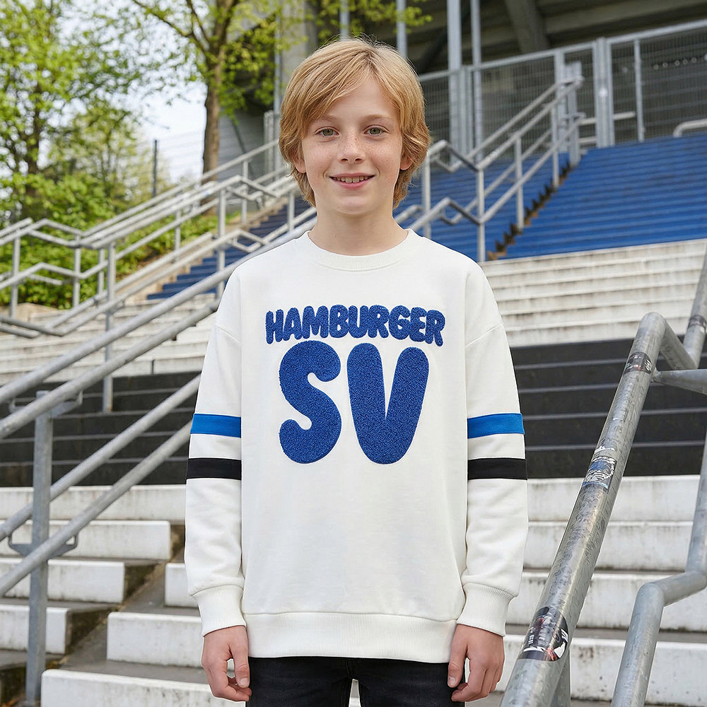 Das weiße Sweatshirt Kids „Zac“ mit einem flauschigen "Hamburger SV"-Schriftzug vorne wird durch die blauen und schwarzen Streifen an den Ärmeln abgerundet. Dieser Kinder Pullover kann super zur Schule, in der Freizeit und auch im Stadion getragen werden.