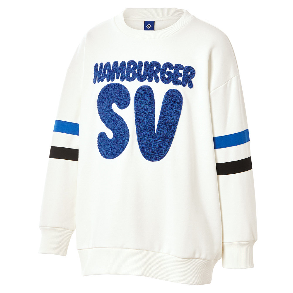 Das weiße Sweatshirt Kids „Zac“ mit einem flauschigen "Hamburger SV"-Schriftzug vorne wird durch die blauen und schwarzen Streifen an den Ärmeln abgerundet. Dieser Kinder Pullover kann super zur Schule, in der Freizeit und auch im Stadion getragen werden.