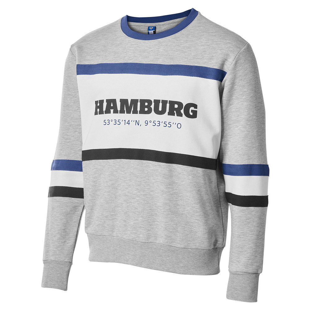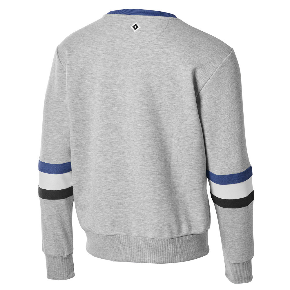 Mit dem grauen Sweatshirt „Ulrik“ vom HSV kannst du jedem zeigen, wo dein Herz schlägt! Der grau-melierte Pullover punktet mit sportlichen Kontraststreifen in den Vereinsfarben sowie dem markanten „HAMBURG“-Schriftzug auf der Brust. Darunter finden sich die geografischen Koordinaten vom Mittel- und Anstoßpunkt im Volksparkstadion. Abgerundet wird der Pullover durch die HSV-Raute im Nacken.