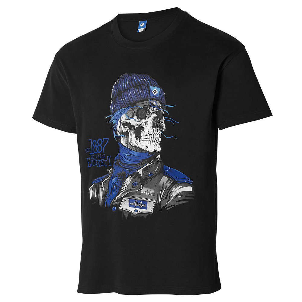 Zeige deine Leidenschaft für den HSV auf eine völlig neue Art und Weise mit dem T-Shirt „Ewigkeit – Abschlach!“. Sei mit dem schwarzen Shirt mit Skelett-Motiv und „Von 1887 bis in alle Ewigkeit“-Schriftzug bereit, alle Blicke auf dich zu ziehen, während du deine Unterstützung für deinen Lieblingsverein zeigst. Abgerundet wird das Shirt durch eine HSV-Raute auf der Mütze.