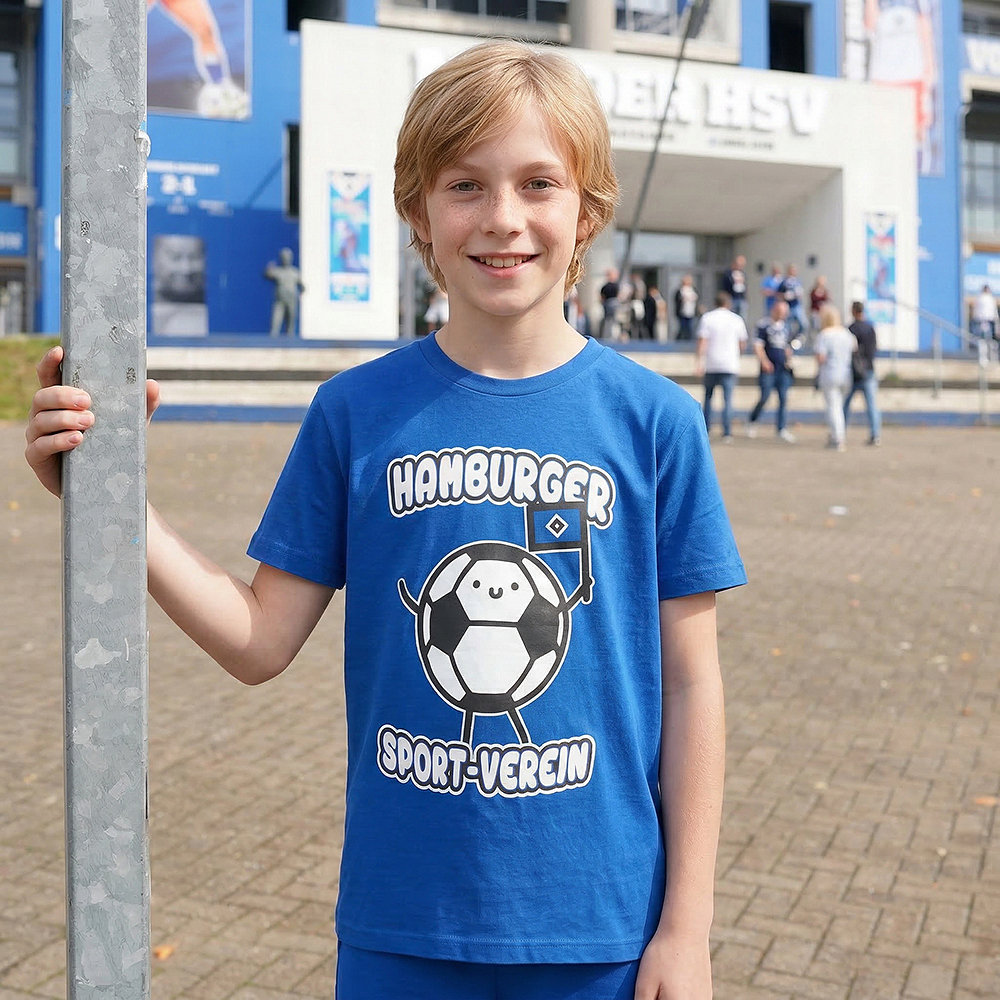 Das blaue Kinder T-Shirt „Miko“ vom HSV mit „Hamburger Sport-Verein“ und Fußball auf der Vorderseite ist perfekt, um deine Liebe zum Verein auf dem Schulhof und in der Freizeit jeden Tag zu zeigen.