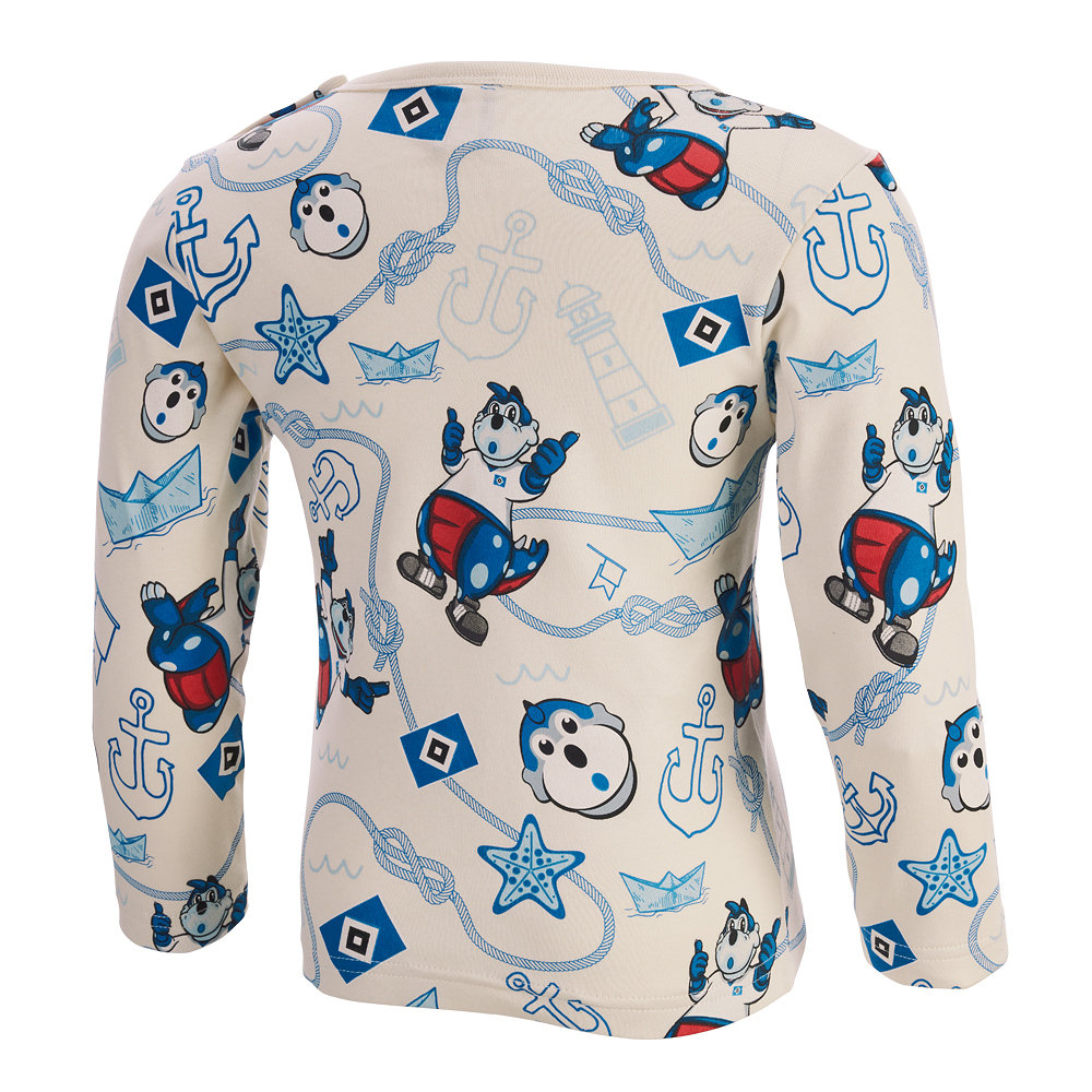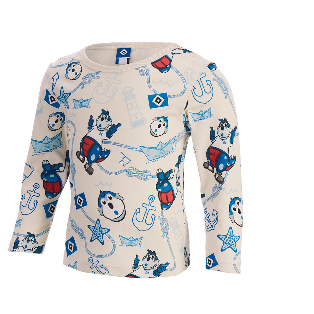 • Mit dem offwhitefarbenen Baby Longsleeve „Dino Hermann“ vom HSV ist der neue Nachwuchssupporter perfekt für den Alltag gekleidet und zugleich ein echter Hingucker! Das Langarmshirt mit einem farbigen Allover-Print auf der Vorder- und Rückseite besteht zu 100% aus kontrolliert biologischer Biobaumwolle.