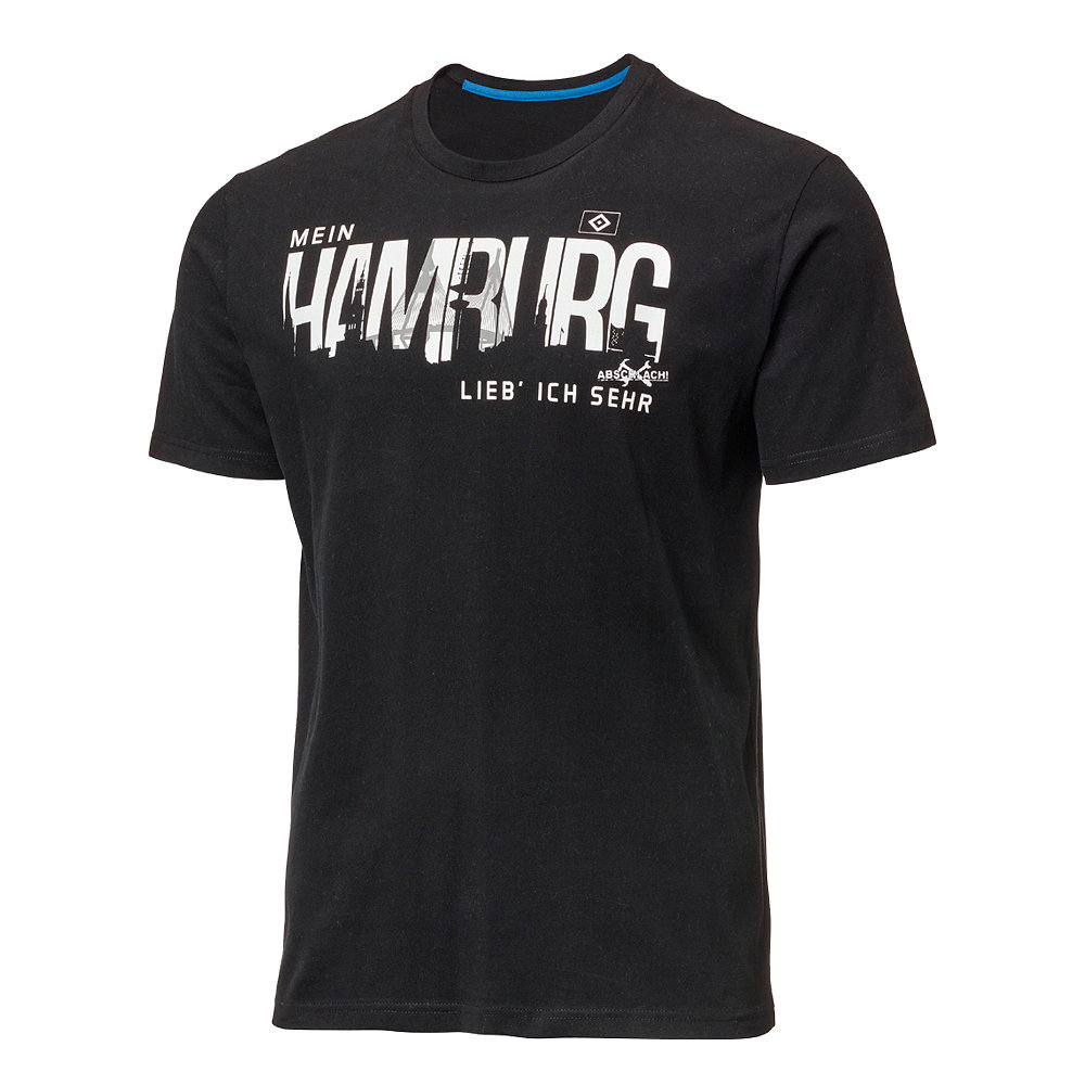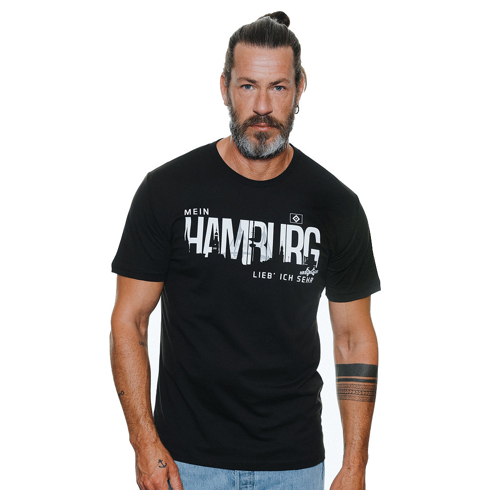 Herren Rundhals-T-Shirt in schwarz. Entstanden in Zusammenarbeit mit den Jungs von "Abschlach!" zeigt der Druck den Namen der Stadt, die wir so lieben: Mein Hamburg lieb' ich sehr! Texte mit freundlicher Genehmigung der Hamburger Band "ABSCHLACH!": www.abschlach.de, Facebook, Instagram und Youtube.