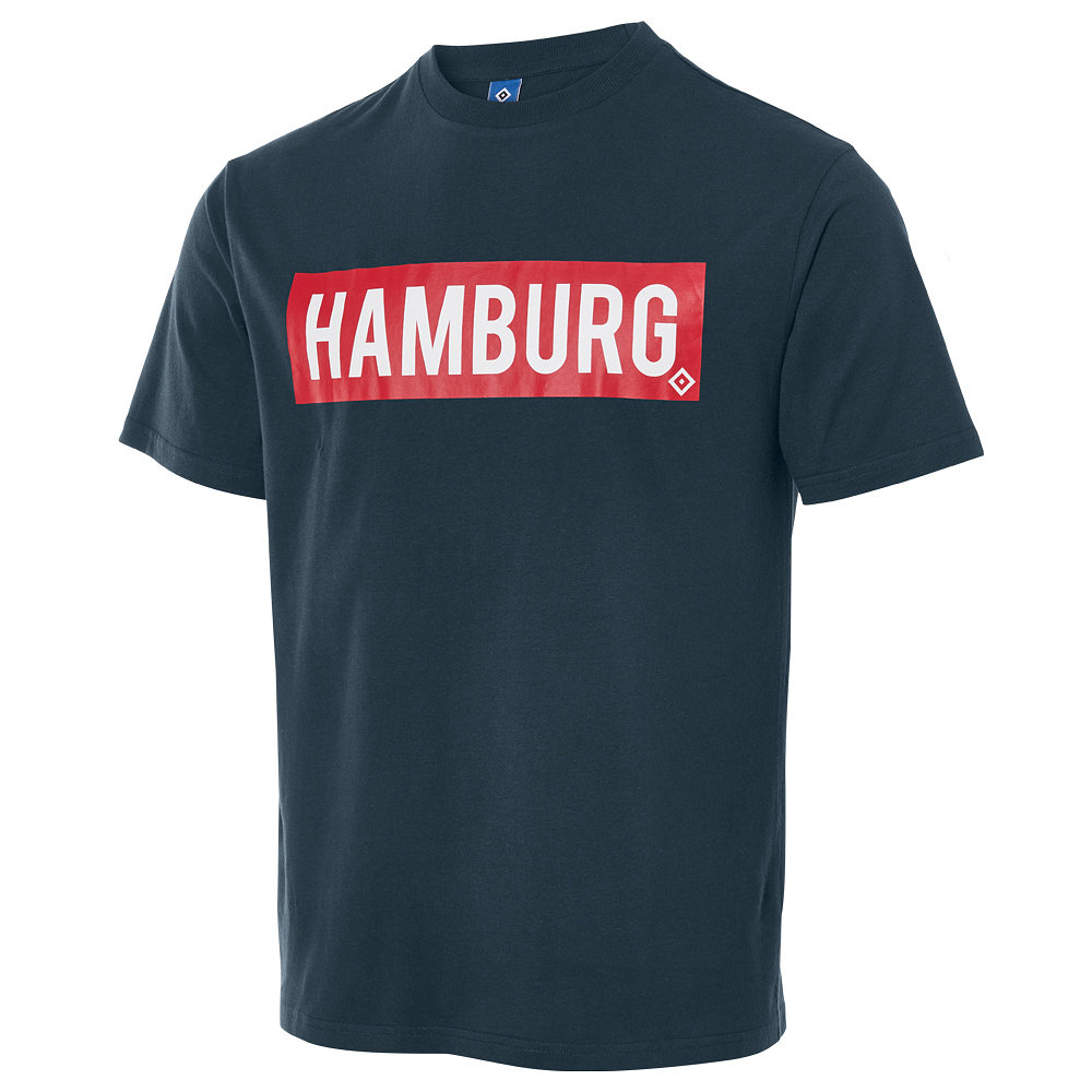 • Mit unserem dunkelblauen T-Shirt „Snorre“ hast du einen echten Klassiker in deinem Kleiderschrank. Das Shirt mit einem weißen Hamburg-Schriftzug in einem auffälligen roten Kasten auf der Brust wird durch eine HSV-Raute abgerundet.