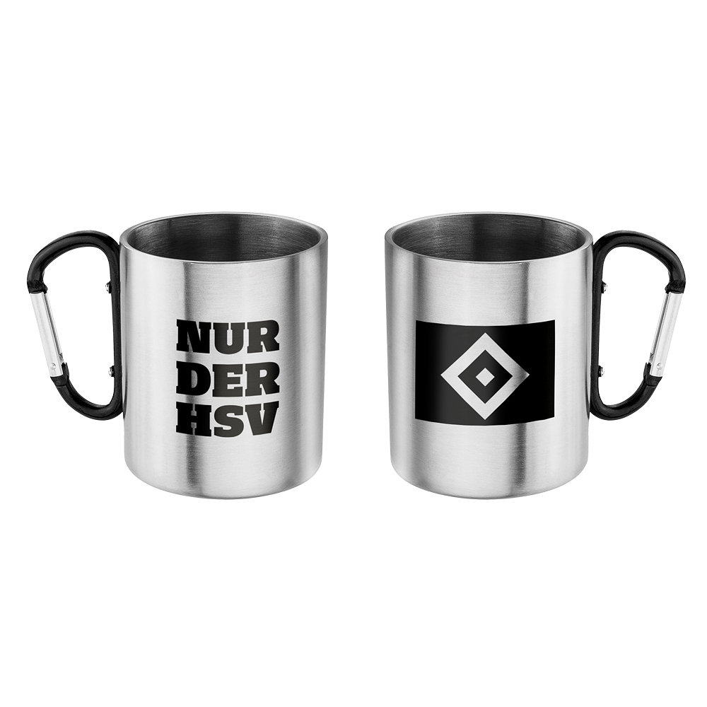 Egal ob am Berg, zum Festival oder im Alltag, mit dieser Tasse nimmst du den HSV überall mit hin. Die silberne Tasse „Karabiner“ mit „Nur der HSV“-Schriftzug und HSV-Raute lässt sich ganz einfach mit dem Karabinerhaken am Rucksack befestigen.