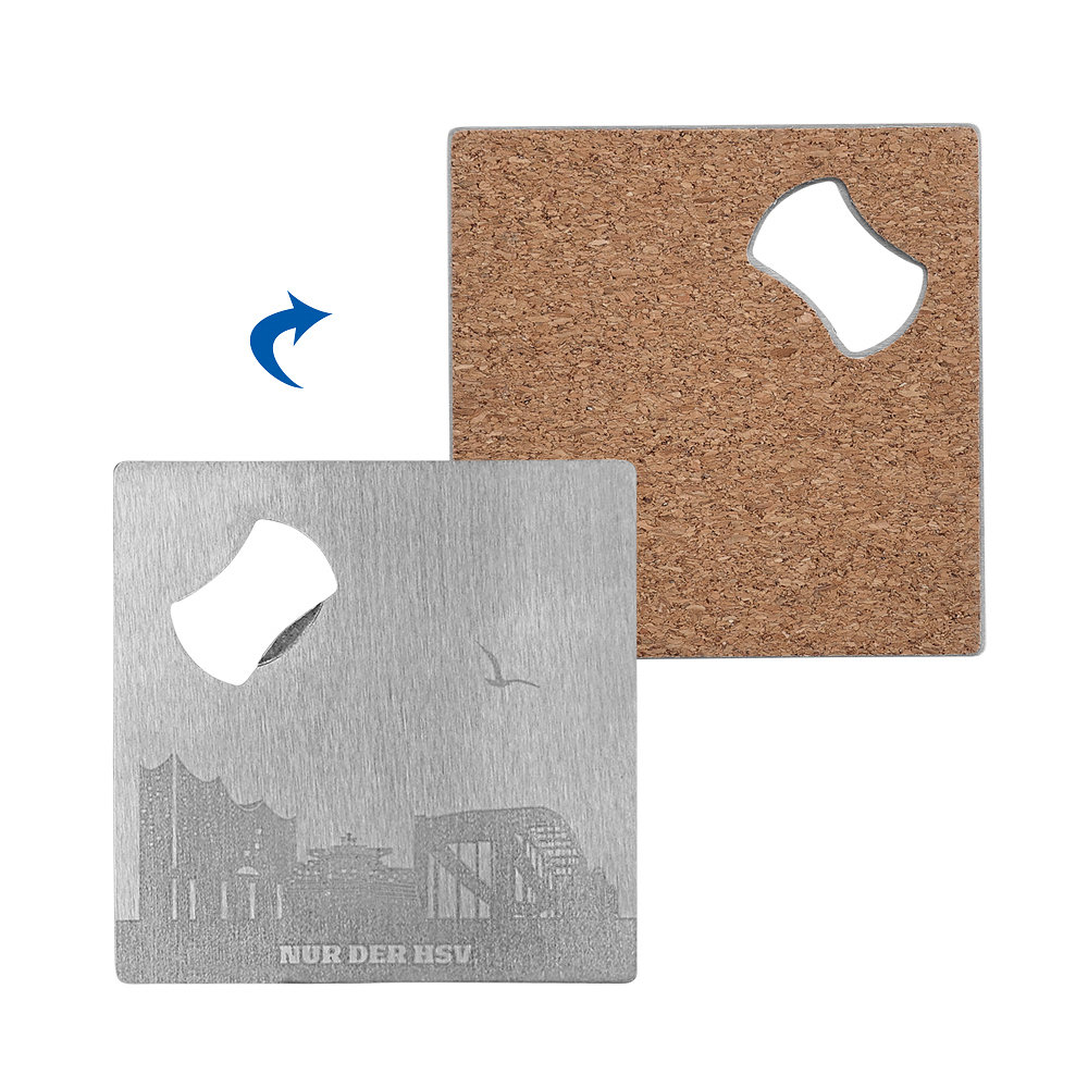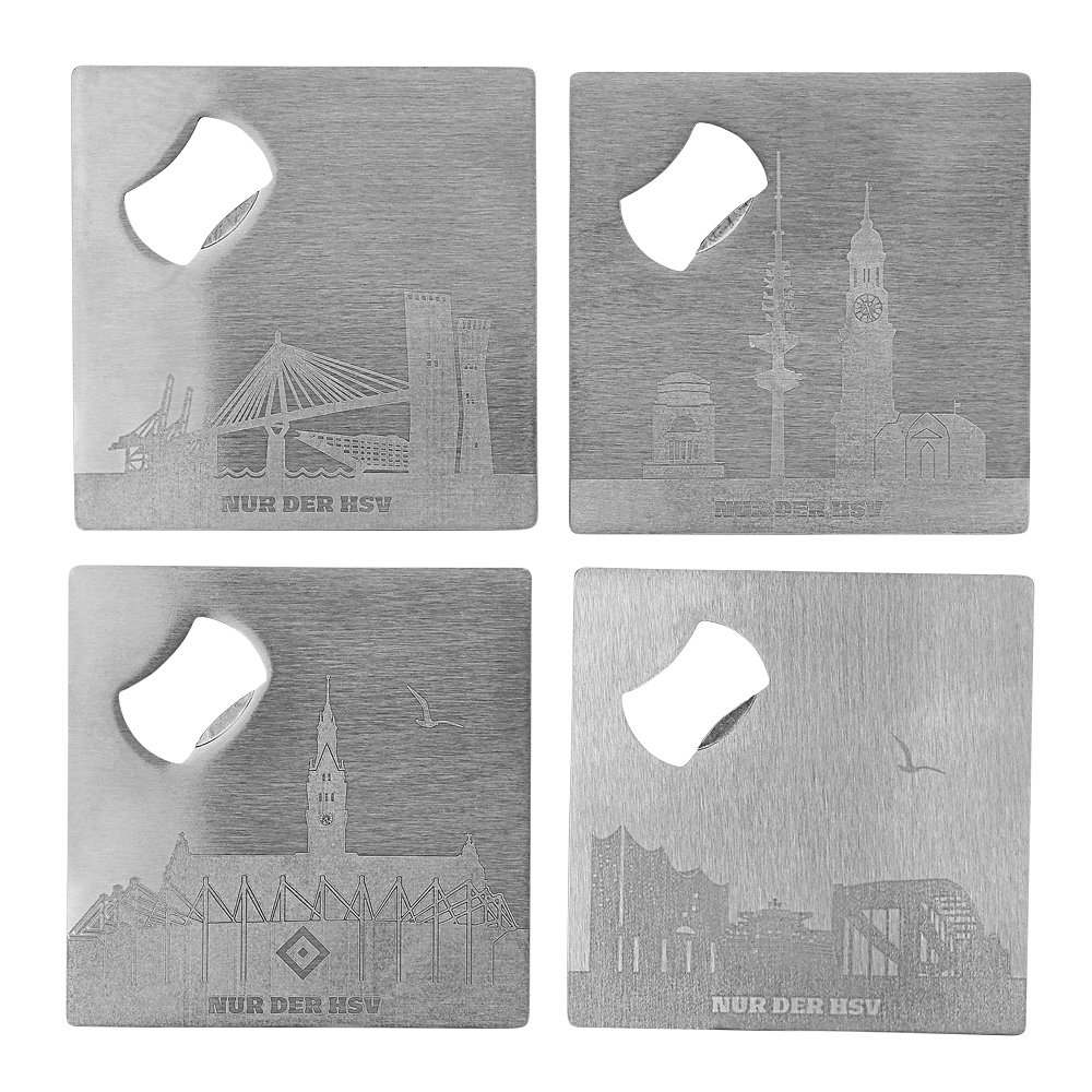 Das Untersetzer 4er-Set „Skyline“ vom HSV kannst du gleichzeitig als Flaschenöffner nutzen, was es zum perfekten Begleiter für Partys und Veranstaltungen macht. Die silbernen Untersetzer mit unterschiedlichen Hamburger Sehenswürdigkeiten werden durch den Schriftzug „Nur der HSV“ abgerundet und verschönern jeden Esstisch.