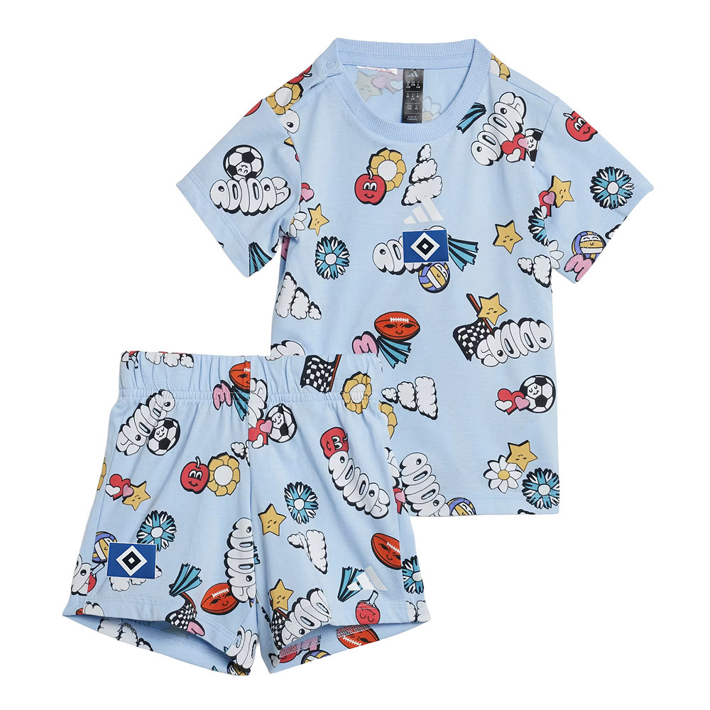 Der kurze hellblaue adidas Anzug besteht aus einem T-Shirt und einer Hose und versprüht bei Babys und Kleinkindern jede Menge fröhliche Vibes. Dank der weichen Baumwolle garantiert das Set den ganzen Tag über Tragekomfort pur und zeigt dank der HSV-Raute, für welchen Verein das Herz schlägt. Der auffällige, farbenfrohe Allover-Print regt die Fantasie an und sorgt immer wieder für gute Laune.