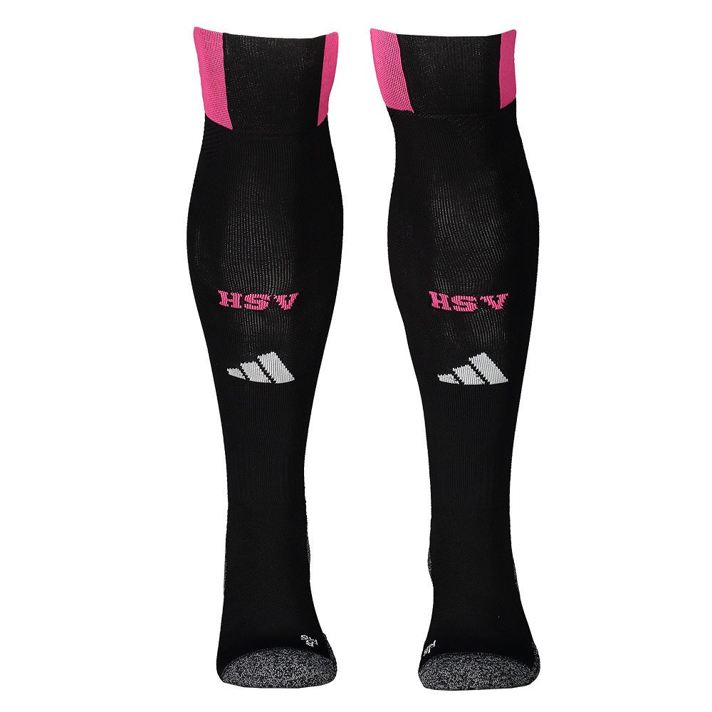Mach dein Trikotoutfit der Saison 2025/26 mit den adidas Ausweichstutzen perfekt! Die schwarzen Stutzen mit dem klassischen schwarz-neon-pinke Ringel am Bündchen: Das ist der HSV! Die Ausweichstutzen sind am Mittelfuß extra verstärkt für einen besonders hohen Tragekomfort.