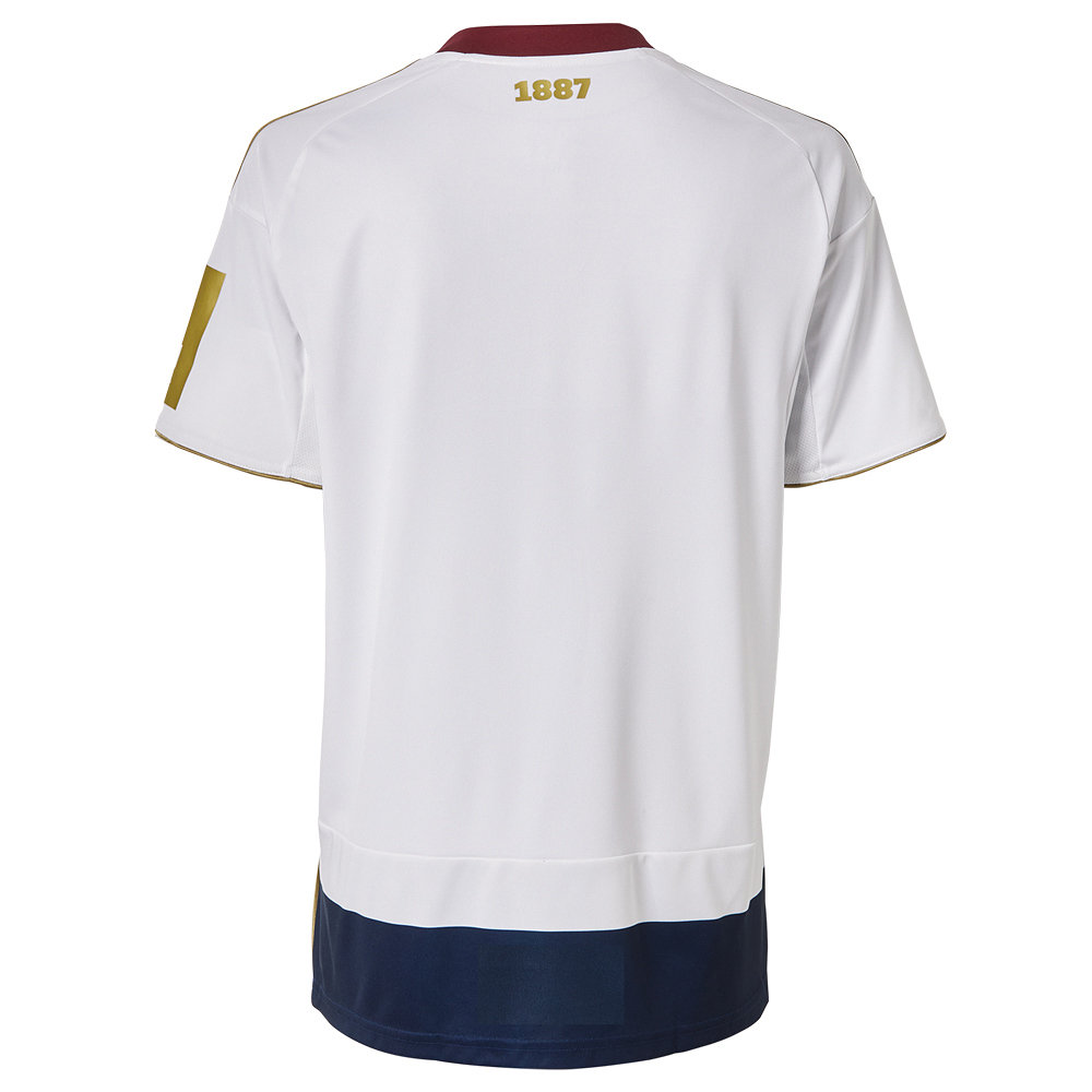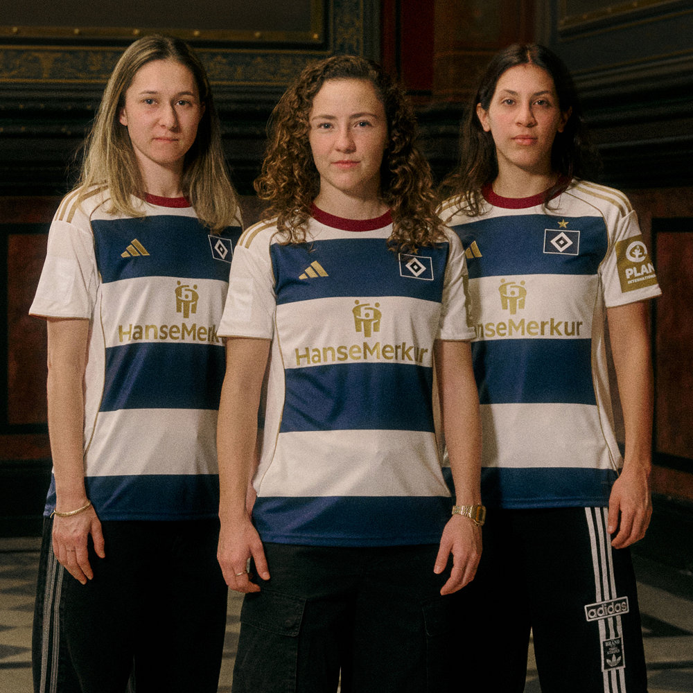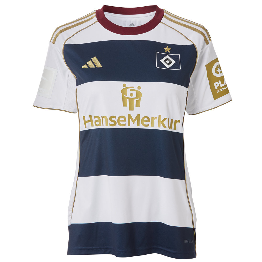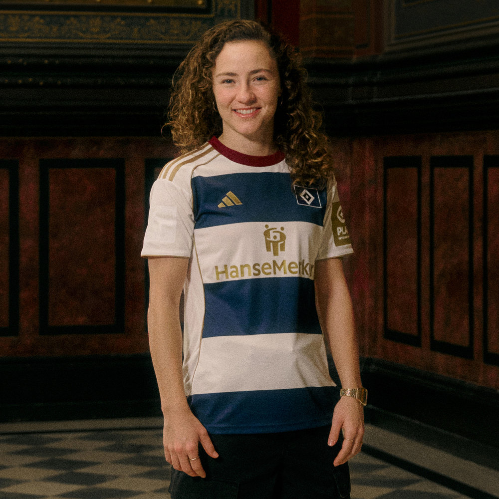 Anlässlich von 1887 Bundesligaspielen gibt es das weiße adidas Sondertrikot Damen vom HSV. Unter dem Motto „Sturm und Glanz“, dass gleichermaßen die goldenen und glorreichen Momente wie auch die stürmischen Zeiten und die pure Wucht des HSV feiert, zeichnet das Damentrikot den Weg durch die 1887 Partien im Fußball-Oberhaus nach. Das primär in Weiß gehaltene Damen Sondertrikot mit blauen Querstreifen und dunkelrotem Rundkragen besticht durch zahlreiche goldene Elemente: Darunter ein goldener „1887“-Nackenprint, goldene adidas-Streifen auf der Schulter und ein goldener Rückennummer- und Sponsorenprint.