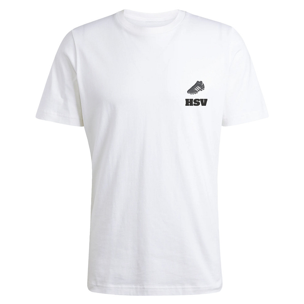 Mit dem weißen adidas T-Shirt Copa kannst du deine Begeisterung für den schönsten Sport der Welt zeigen. Das Shirt mit dem legendären Copa-Schuh und HSV-Schriftzug auf der linken Brust wird durch ein Label im Nacken mit „adidas Copa Mundial“ abgerundet.