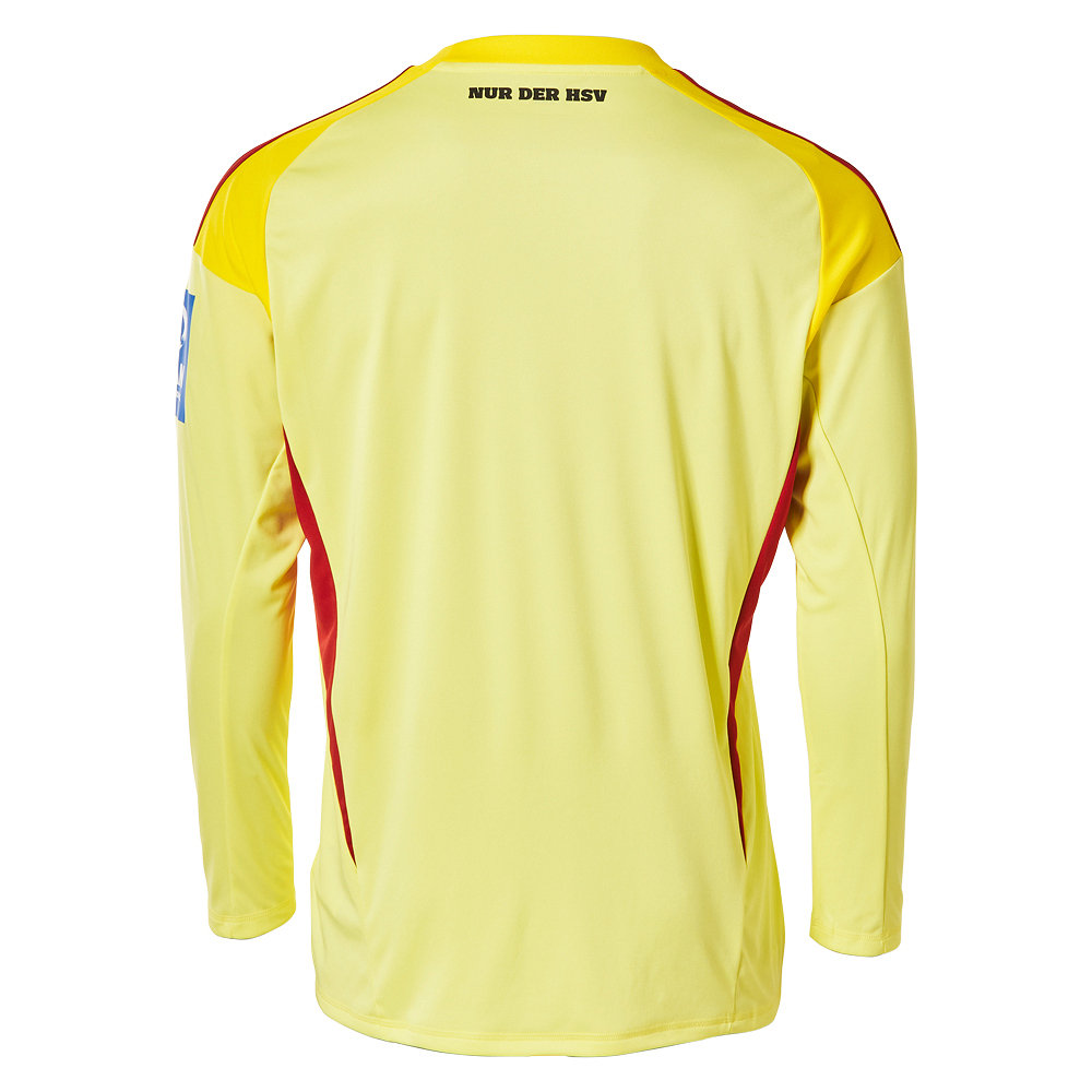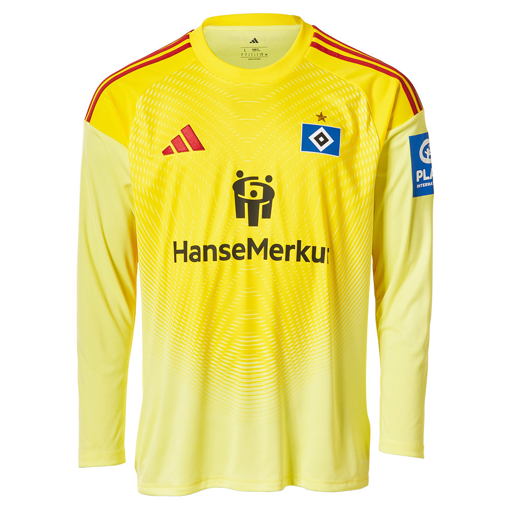 Das gelbe Kinder Torwarttrikot 2025/26 überzeugt in kräftigem Gelb und besticht durch sein dynamisches Muster auf der Vorderseite. Die gestickte HSV-Raute mit Meisterstern und das rote adidas-Logo auf der Brust runden das Design optimal ab.