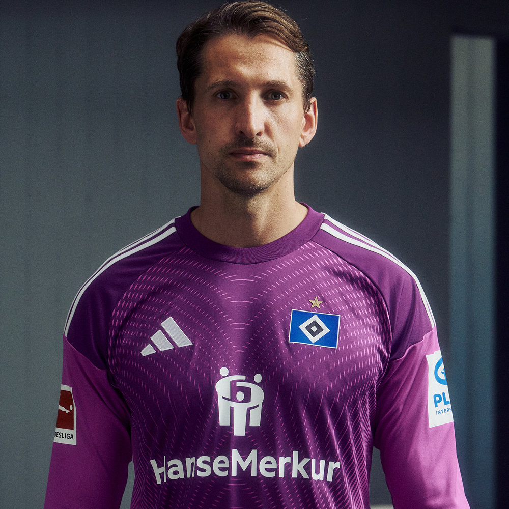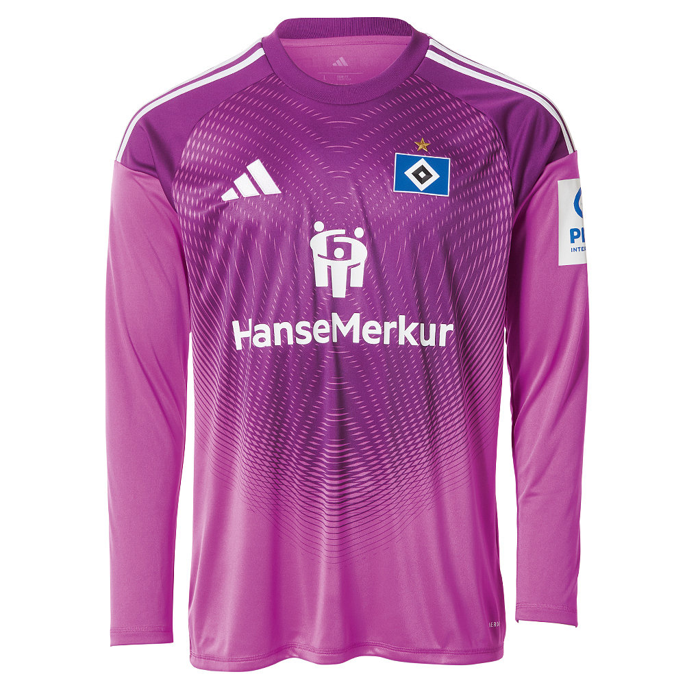 Das Kinder Torwarttrikot 2025/26 überzeugt in kräftigem Pink und besticht durch sein dynamisches Muster auf der Vorderseite. Die gestickte HSV-Raute mit Meisterstern und das rote adidas-Logo auf der Brust runden das Design optimal ab.