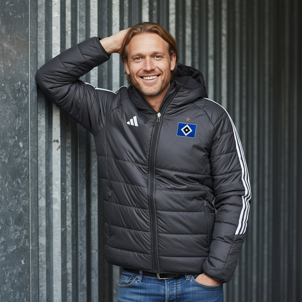 Die schwarze adidas Winterjacke vom HSV mit HSV-Raute und adidas-Logo auf der Brust sorgt dank des gepolsterten Außenmaterials für ein angenehmes Tragegefühl, wenn du dein Lieblingsteam von der Tribüne oder der Seitenlinie aus anfeuerst.